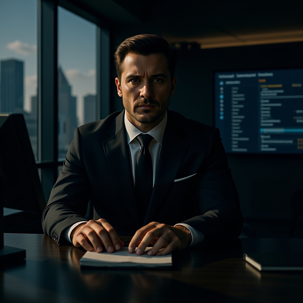 An intense scene captures a modern Ironman, now a powerful businessman, sitting in his sleek, high-rise office. The room is bathed in dramatic lighting, casting long shadows that emphasize the sharp angles of his tailored suit and the polished surfaces around him. His focused gaze is fixed on a digital screen filled with complex market data, reflecting his strategic mindset and the high-stakes world of corporate negotiations. The sunlight filtering through the floor-to-ceiling windows highlights his iron determination and the subtle metallic undertones of his business persona. The ambiance exudes both power and meticulous precision as he plans his next innovative venture.