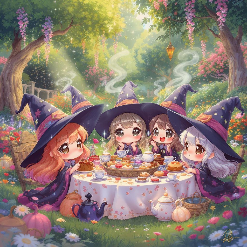 View this AI-generated image featuring an enchanting scene filled with charm and delight featuring a chibi style witch tea party where joy radiates from every corner the setting is a whimsical garden bursting with vibrant colors and lively details creating an atmosphere of pure happiness adorable wi