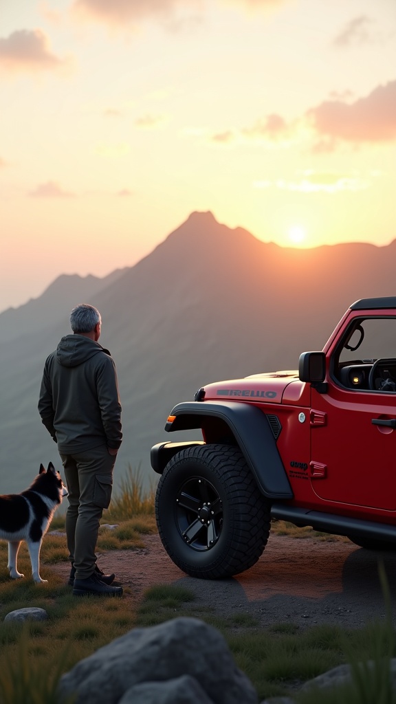 In a breathtaking scene of ultra-realism, a red Jeep Gladiator stands against a backdrop of dramatic lighting at a pale sunrise, capturing a cinematic, hyper-detailed essence reminiscent of Studio Ghibli and the intricate detailing of John William Turner. This masterpiece, rendered in Unreal Engine 5, showcases a low-angle perspective with 4K fidelity, highlighting the Jeep's rugged features, including its durable Pirelli SCORPION™ ALL TERRAIN PLUS tires, perfectly poised for adventurous excursions. A medium-built man, his very short gray hair catching the faint morning glow, faces away, absorbed in the stunning and authentic Cantabrian landscape, overlooking the majestic Picos de Europa. Accompanying him is his loyal Siberian Husky, a sleek-coated companion also mesmerized by the panoramic view. Clad in high-performance outdoor gear—a weather-proof jacket, functional cargo pants, and robust hiking boots—the man epitomizes readiness for exploration in even the harshest terrains. The scene exudes an awe-inspiring atmosphere, with the lush, verdant mountains extending beneath a moody, atmospheric sky, as the iconic peaks of the Picos de Europa rise in the breathtaking distance.