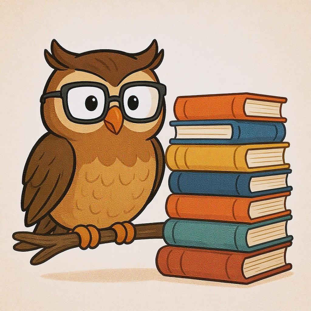 A cartoon-style scene with a wise owl sporting square glasses perched alongside a vibrant stack of differently colored books, all set against a light-colored background.