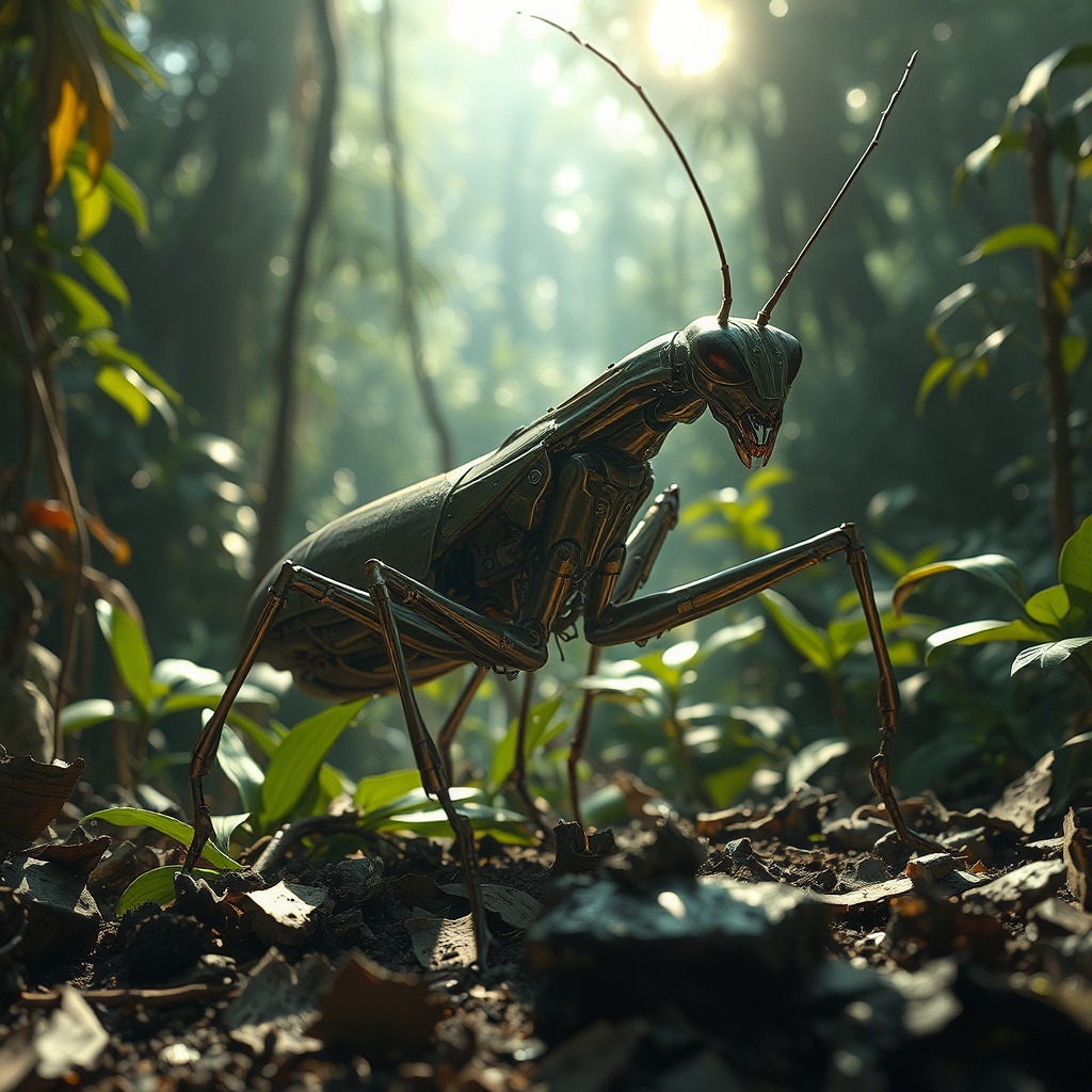 View this AI-generated image featuring a surreal scene of a cybernetic praying mantis in a dense jungle surrounded by fragments of torn metallic and organic remains as sunlight filters through the lush canopy casting an eerie glow on the mechanical predator s sleek reflective exoskeleton. Created us