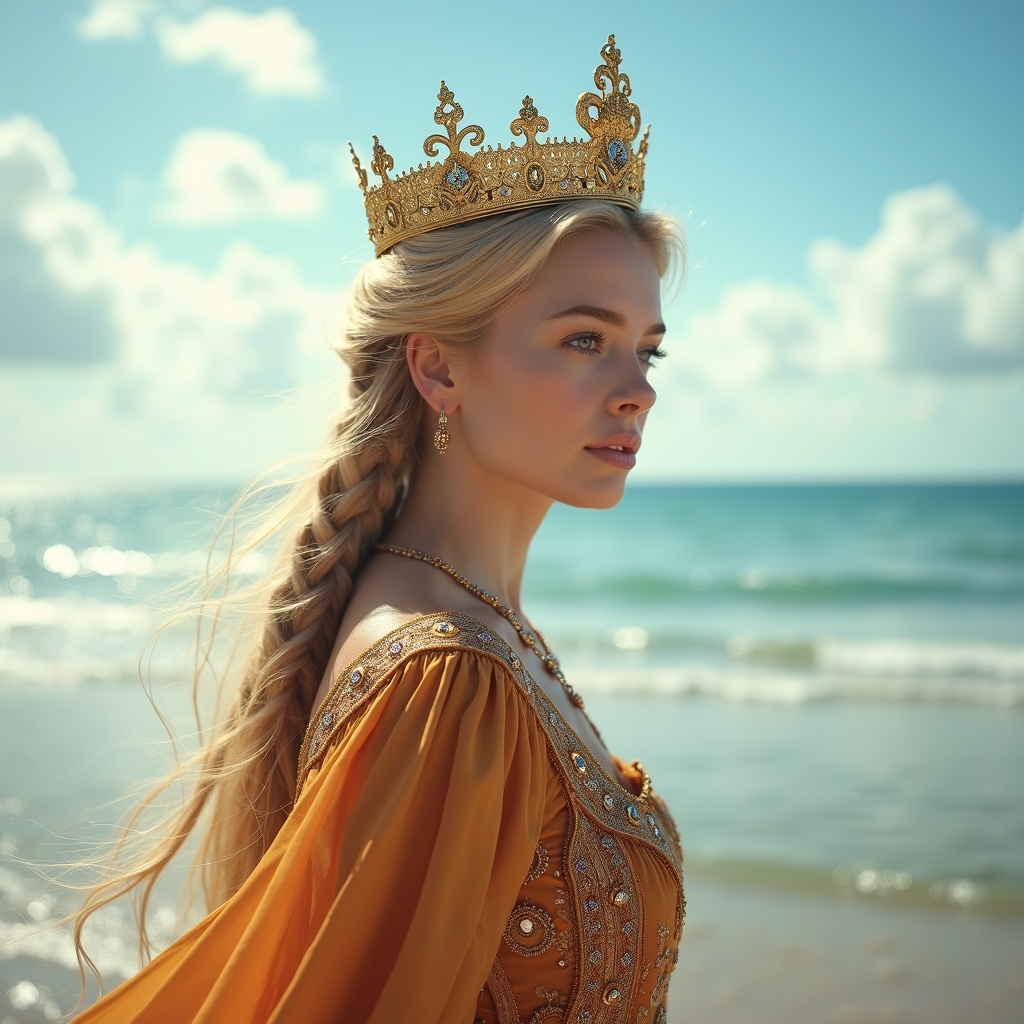 A captivating scene of a beautiful Russian princess strolling along a serene beach. She wears a golden crown and a traditional Russian dress intricately adorned with cultural patterns. Her long, braided blonde hair flows gracefully down her back, catching the gentle sea breeze. She possesses a mesmerizing gaze and an alluring expression, with perfectly symmetrical, strikingly detailed eyes and facial features. The background features a harmonious symmetry of blue skies and scattered fluffy clouds above a tranquil body of water. The scene evokes the aesthetic of a cinematic film still from the 1980s, as if captured on Kodak Portra 800 film, showcasing high realism and ultra-detailed textures. The radiant, magical beams of light traverse the scene, casting soft shadows and highlighting every detail with a warm glow, enhanced by backlighting and ambient occlusion. The composition invites a sense of excitement and tranquility, captured in sharp focus, as though rendered with the precision of a 3D engine, exuding both realism and dreamlike quality. The analog style evokes a nostalgic, yet timeless, art piece suitable for an art station or magazine cover.