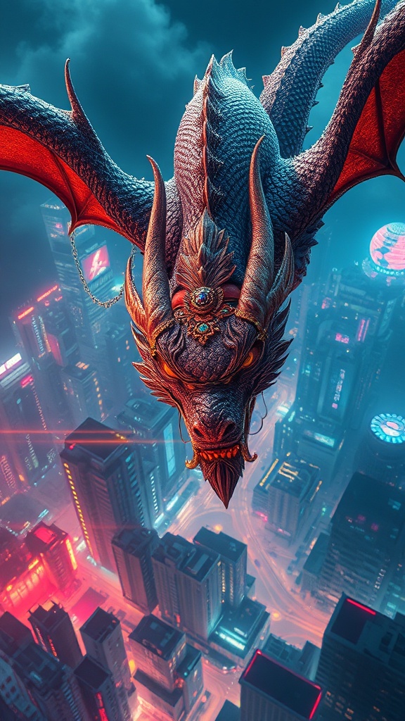A surreal scene where a majestic dragon soars through a modern cyberpunk fantasy city, blending the delicate elegance of Kyoto Animation’s anime style with traditional Chinese artistry. The composition is drenched in cinematic and ethereal lighting, showcasing intricate and incredibly detailed textures. Rich colors flood the scene, highlighting the dragon’s glittering scales and ornate jewelry. The creature glides above a sprawling urban landscape, illuminated by neon lights, with an aerial view casting shadows and depth in stunning HDR and UHD quality. The scene captures a dark fantasy vibe, showcasing beautifully smooth lines and a harmonious blend of traditional and futuristic elements. The dragon's eyes gaze directly at the viewer, exuding an air of mystery and grace, all captured in flawless detail to create a mesmerizing masterpiece with stunning light and shadow interplay.