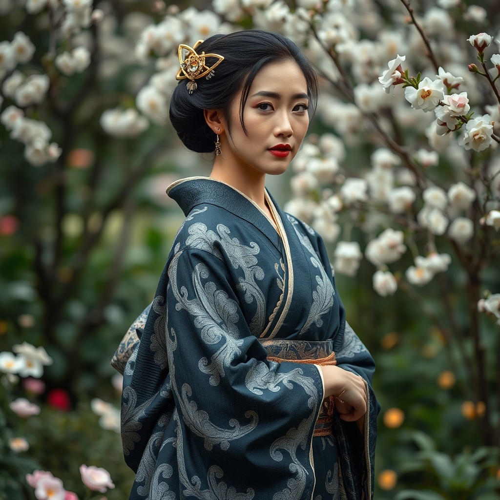 A captivating scene of a Japanese woman adorned in a kimono, featuring intricate patterns of dark silver and navy with delicate curves, standing gracefully amidst a blooming garden. This scene, reminiscent of Qian Xuan's elegance, intertwines dark silver with accents of light gold. Infused with classic Hollywood glamour and a touch of medieval inspiration, the composition captures a timeless allure. Captured through the lens of a Samyang AF 14mm f/2.8 RF, akin to the artistic style of Bella Kotak, and shot with a Nikon D750, the image showcases a harmonious blend of curvilinear elements in an expressive manner.