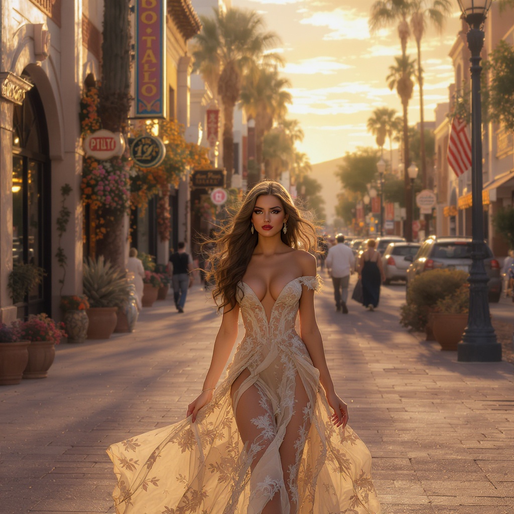 A hyper-realistic scene of a stunning young woman walking along an Arizona city street, inspired by the style of JC Leyendecker and Art Nouveau. The composition captures her in striking detail and vibrant colors, with an intricate focus on the textures and patterns of her surroundings. Rendered in high-definition 3D with Octane, the scene highlights her flowing hair, elegant attire, and the warm glow of the desert city ambiance, set against a clear evening sky. The vertical aspect ratio emphasizes her graceful presence within the bustling urban landscape.