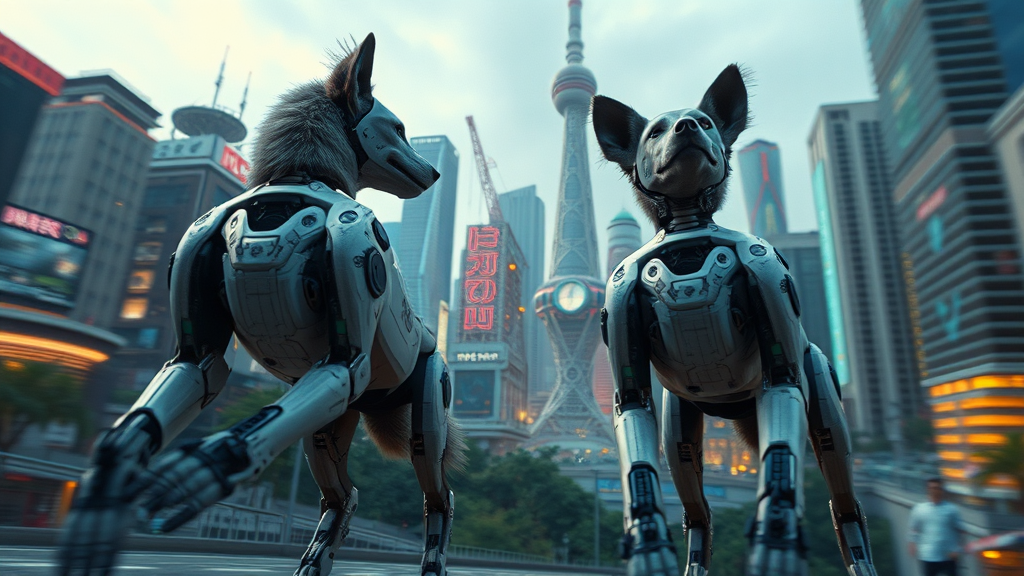 Scenic cityscape of a cyberpunk metropolis featuring a watercolor pastel mix in ultra-realistic style. The scene includes two hyper-detailed robotic dogs with natural fur textures, full bodies visible, looking from below. Each dog has more than four animal legs. The view captures a dynamic angle, with elements appearing slightly blurred, suggesting motion and depth. Subtle references to futuristic technology are woven into the landscape, such as glowing neon lights and towering structures. The atmosphere blends natural elements with urban innovations, resulting in a unique perspective.