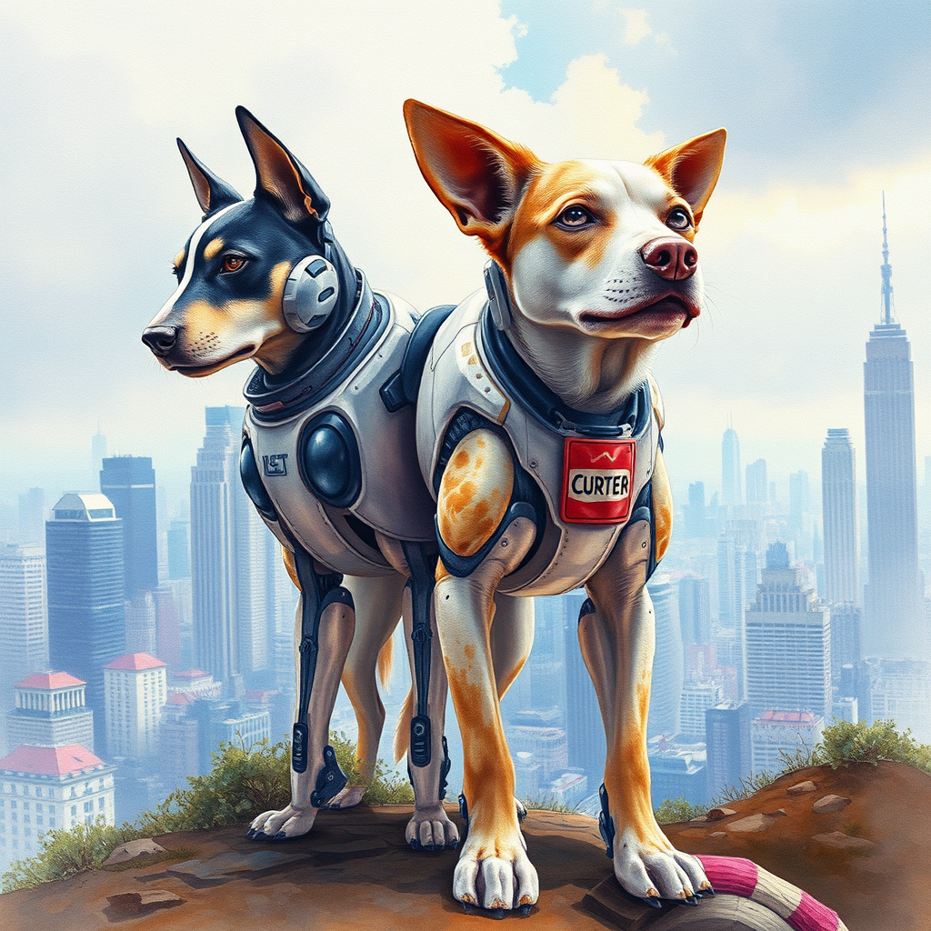 scenic view landscape cyberpunk city, highly detailed watercolor pastel mix, ultra realistic, robotic dog, hyperdetailed full body visible, looking from below, natural fur, two dogs, animal fur, multiple animal legs, cropped, low resolution, artistic touch, blurred edges, distinct features, multiple perspectives, curvaceous, plump, slight strabismus, cutout clothing design, side slit, unique anatomy, creative typography, name embedded, imaginative elements, conceptual enhancements, surreal aesthetics.