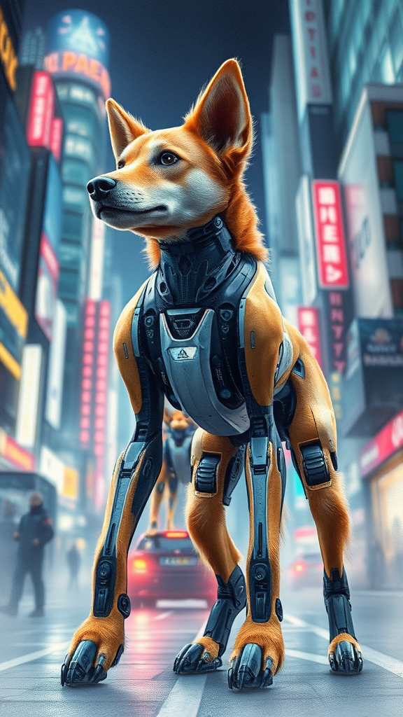 scenic view landscape cyberpunk city of highly detailed watercolor pastel mix ultra-realistic, futuristic robotic dog with natural fur, highly detailed full body visible from below, two dogs each having a unique fur pattern, multiple legs, cityscape background slightly blurred to emphasize depth, vibrant palette, urban setting, reference sheet inspiration, hints of mechanical elements in limbs, expression showing curiosity, sleek and elegant design, ambient neon lights reflecting off surfaces, captivating atmosphere, emphasis on shadows and highlights, mix of organic and synthetic textures, minimal distractions, artistic interpretation with slight abstraction, flawless construction of features, harmonized blend of technology and nature, clear focus on character prominence, exploring a world bridging organic life and technology.