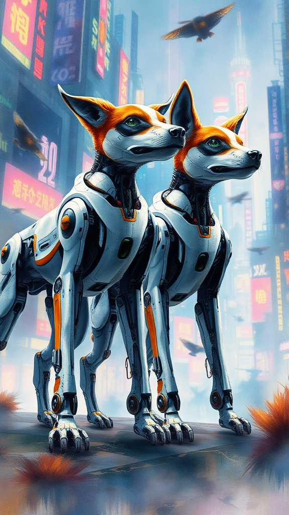 scenic view landscape cyberpunk city with highly detailed watercolor pastel mix, ultra-realistic, featuring two robotic dogs with hyperdetailed full bodies visible, natural fur, more than four legs each, set against an intricate backdrop. The scene captures the dogs from below, highlighting their unique design and lifelike textures of the fur. The vibrant city is alive with neon lights, creating an atmosphere of futuristic wonder. Each dog has distinct features with rich detailing, including a mix of natural and synthetic elements. The landscape incorporates elements of motion and energy, blending seamlessly with the serene quality of the watercolor effect. The cityscape is bustling yet maintains a dreamlike quality, emphasizing the intersection of nature and technology.