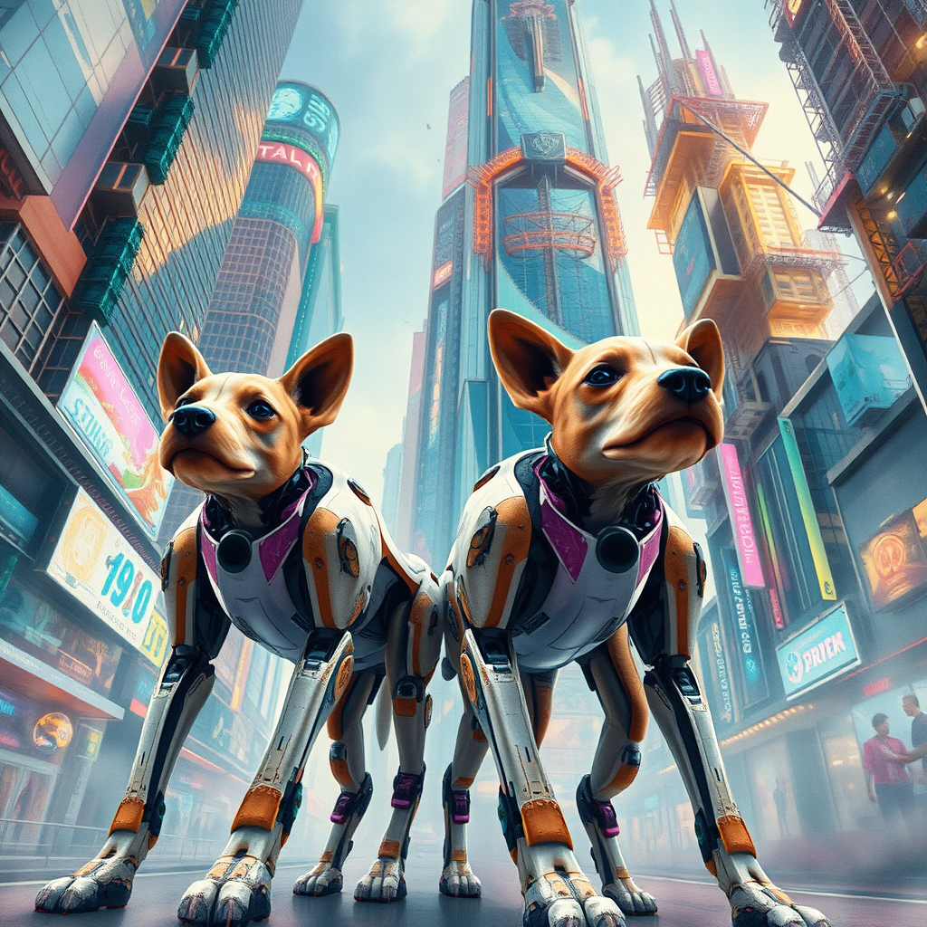 scenic view landscape cyberpunk city with highly detailed watercolor pastel mix ultra-realistic elements, two hyper-detailed robotic dogs with visible full bodies, natural fur texture, and more than four legs. The scene is dynamic and vibrant, capturing the essence of a futuristic urban environment. The perspective is from below, emphasizing the grandeur of the architecture. Despite being lowres and slightly blurry in areas, the image retains its artistic charm. The futuristic city is bustling with neon lights and towering skyscrapers. The robotic dogs appear intelligent and curious, gazing at the viewer. They are adorned with subtle technological enhancements that blend seamlessly with their lifelike fur.
