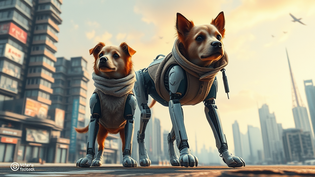 Scenic view of a cyberpunk city with a highly detailed watercolor pastel mix, showcasing an ultra-realistic robotic dog. The scene includes two dogs with hyper-detailed full-body visibility, looking from below. Both dogs have natural-looking fur, with one possessing more than four legs. Elements of blurriness and watermark effects are subtly incorporated, evoking a sense of a reference sheet or multiple views. The dogs exhibit playful features like strabismus and curvy, plump forms. Clothing elements are creatively cut with side slits, and there are intentional flaws such as an extra leg and an imperfect foot. The landscape remains immersive with embedded text and user names to add a layer of depth and realism.