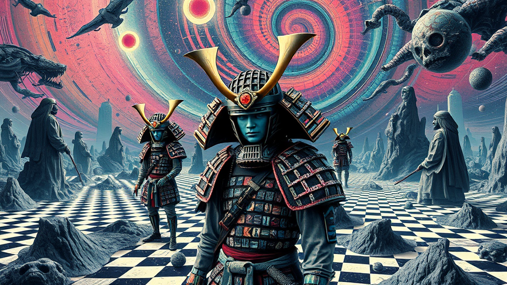 Schizophrenic nuclear samurai immersed in a tessellated AI landscape, patterned with op art checkerboards and swirling digital omens, inspired by the style of Jean Leon Gerome, infused with a surreal and chaotic atmosphere.