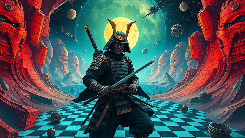 Schizophrenic nuclear samurai in a futuristic landscape, surrounded by a tesselated AI omen. Inspired by the style of Jean-Leon Gerome, the scene features intricate op art patterns and a vibrant checkerboard design. The environment feels both chaotic and harmonized, capturing the essence of a warrior navigating a digital paradox.