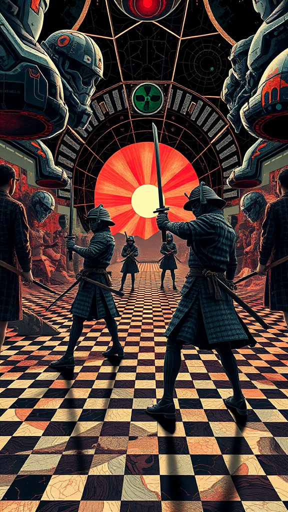 Schizophrenic nuclear samurai visions amidst tesselated AI omens, inspired by the style of Jean Leon Gerome. An intricate 8 op art theme unfolds in a distorted checkerboard pattern, set against the backdrop of a futuristic 2:3 aspect ratio landscape.