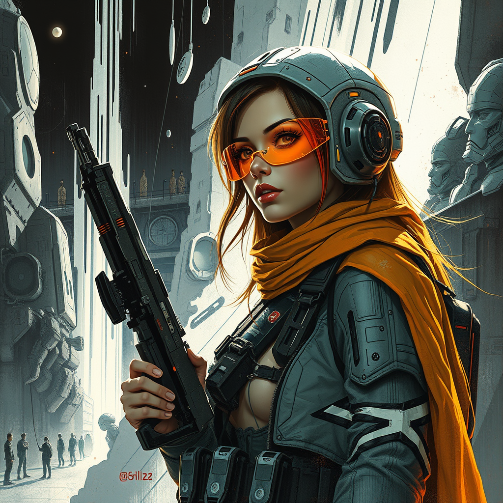 Sci-fi artwork by Roblunda McCallum, capturing blink-and-you-miss-it detail, featuring a full-body character design. The scene is bathed in a contrasting palette of dark white and light orange, blending sci-fi realism with the boldness of pulp comics. Elements of airbrush art and comic book artistry are woven throughout, with a strong sense of narrative and dynamism.