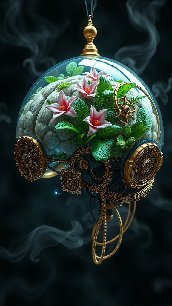 Sci-fi baroque concept design of an anatomically precise brain device, featuring a glass terrarium encasing lush, exotic flora. The device exhibits a steampunk aesthetic, showcasing intricate brass gears and ornate metallic embellishments. Its surface is adorned with elaborate, swirling patterns, highlighted by a soft luminescent glow from embedded LEDs. The brain's neural connections are interwoven with delicate gold filigree, creating an elaborate network that suggests a fusion of organic and mechanical intelligence. Enveloping the structure, wisps of mist add an ethereal quality, enhancing the photorealistic, hyper-detailed appearance of the scene.