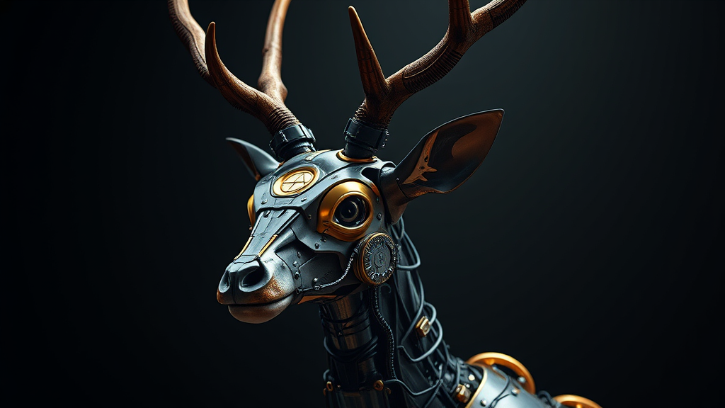 Sci-fi, digital art, a robotic deer head adorned with intricate cybernetic enhancements, its cybernetics designed as if rolled up sleeves. Crafted with the visionary flair of James Paick and the surreal touch of Roger Dean, an aura of eerie elegance permeates, captured in dramatic studio lighting through an 800mm lens. A cybernetic photograph merging realism with photorealism, juxtaposing modern technology against a backdrop of the ordinary and rustic. Its design evokes a sense of the primitive and organic, while maintaining a simplistic, historical, yet traditional essence.