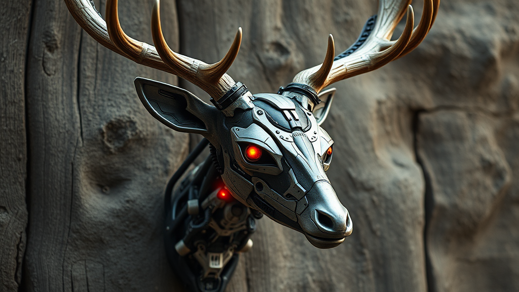 Sci-fi digital art depicting a robotic deer head adorned with intricate cybernetics, designed in the style of James Paick and Roger Dean, emanating a subtle aura of malevolence. The scene is captured with studio lighting and an 800mm lens for a cybernetic photograph that balances realism and photorealism. Blending modern and mundane elements, the deer head integrates with its natural rustic and primitive surroundings, juxtaposing organic textures with simplistic, historical, and traditional undertones in a harmonious yet contrasting design.