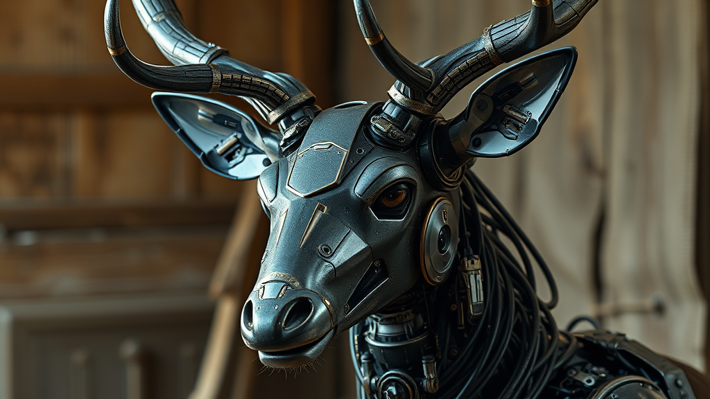 Sci-fi digital art of a robotic deer head adorned with intricate cybernetics, featuring rolled-up mechanical sleeves, designed with influences from James Paick and Roger Dean. The composition carries an ominous vibe under studio lighting, captured through an 800mm lens, evoking photorealism. The setting juxtaposes modern technology with an ordinary, rustic backdrop, blending primitive and organic elements with simplistic historical and traditional aesthetics.