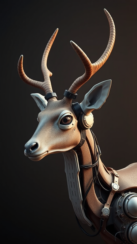 Sci-fi digital art of a robotic deer head adorned with advanced cybernetics, featuring rolled-up sleeve-like components. Designed with influences from artists like James Paick and Roger Dean, it conveys an eerie yet captivating aura. The composition is captured with studio lighting through an 800mm lens, presenting a photorealistic effect. The artwork marries modern cybernetic design with an ordinary, rustic appeal, blending primitive organic elements with historical and traditional aesthetics. The visual narrative plays on the contrast between the futuristic mechanics and the simplistic, natural essence of the deer.