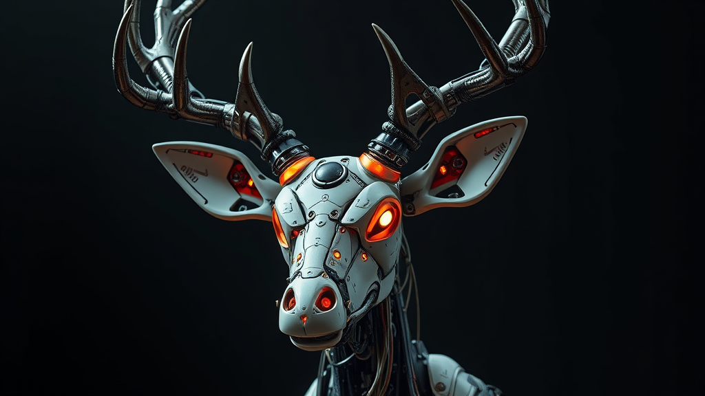 Sci-fi digital art spotlighting a robotic deer head adorned with intricate cybernetics. Its mechanical design is crafted to mimic rolled-up sleeves, exuding a modern yet primitive charm. Inspired by renowned designers like James Paick and Roger Dean, the piece captures an ambiance of quiet menace with an evil undertone. Studio lighting highlights a blend of realism and photorealism, captured through the precision of an 800mm lens. This cybernetic photograph juxtaposes the ordinary and mundane with the extraordinary, blending natural, rustic, and organic elements. The deer head stands as a symbol of traditional yet simplistic historical design, bridging the gap between ancient artistry and futuristic innovation.