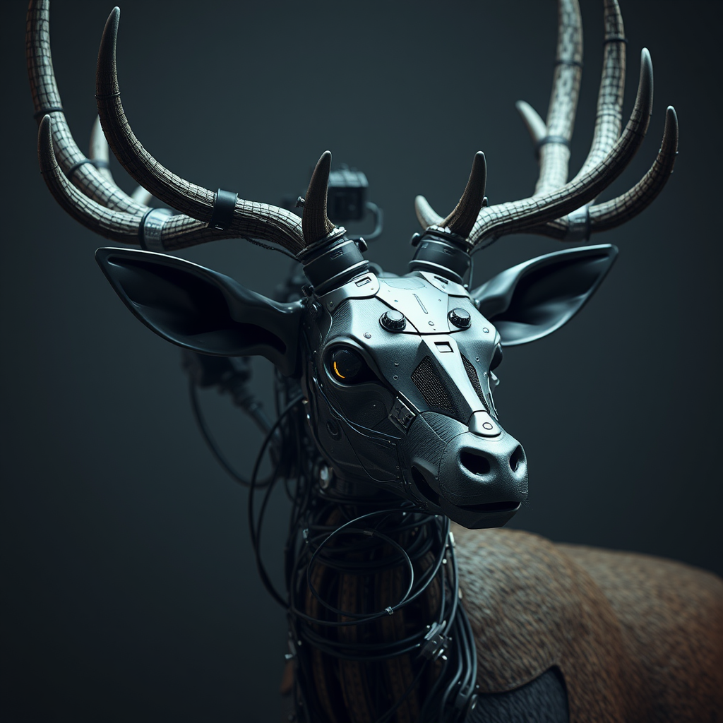 Sci-fi digital artwork of a robotic deer head adorned with intricate cybernetics, featuring rolled-up sleeves of technology, inspired by visions akin to James Paick and Roger Dean. The scene captures an ominous aura under studio lighting, utilizing an 800mm lens for a cybernetic photograph that emphasizes realism and photorealism. This modern piece intertwines with ordinary and mundane elements, juxtaposed against a backdrop that is both natural and rustic. It blends primitive and organic aspects, while maintaining a simplistic yet historically traditional aesthetic.