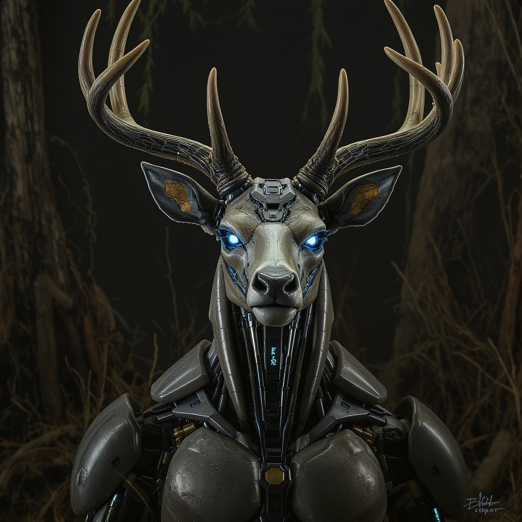 Sci-fi digital art depicting a robotic deer head adorned with intricate cybernetic components, featuring rolled-up metallic sleeves designed with inspirations from James Paick and Roger Dean. The scene emits an aura of subtle menace under studio lighting, captured through an 800mm lens emphasizing photorealism. Balancing modernity and mundanity, the artwork contrasts the high-tech allure of cybernetics with rustic, primitive, and organic elements, evoking a sense of historical and traditional simplicity.