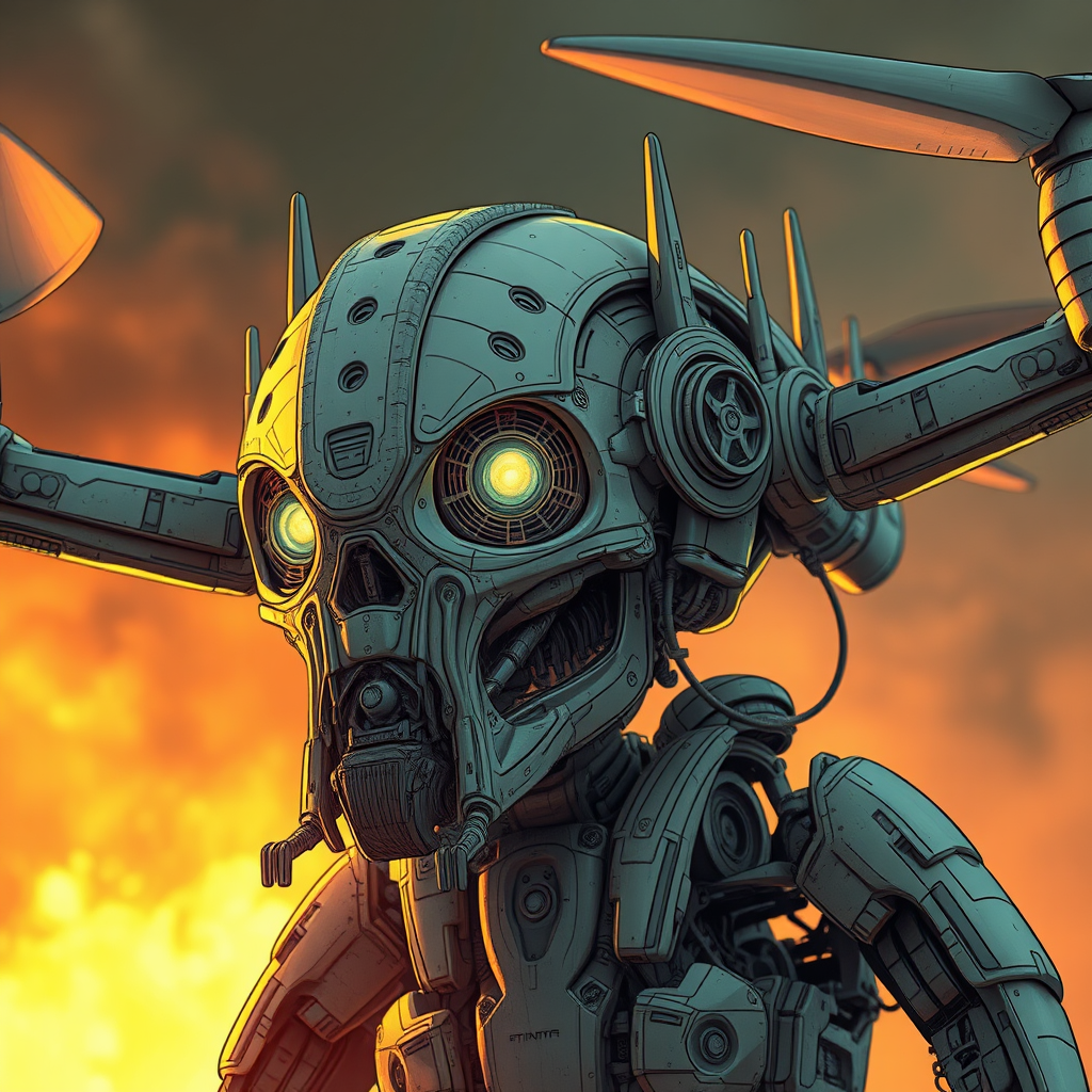 Sci-Fi drone futuristic robot MACHINE BUMPER, HDR, full body, cinematic, intense, dynamic composition, dramatic lighting, vivid color grading, focus on intricately flawed cathedral-esque robot with mutations, distorted and disfigured appearance, grotesque and unsettling, combines elements of baroque and impressionist styles, abstract cartoon sketch with intentionally poor quality, exaggerated forms and anatomy, drawing inspiration from classic art movements in a modern abstract framework.