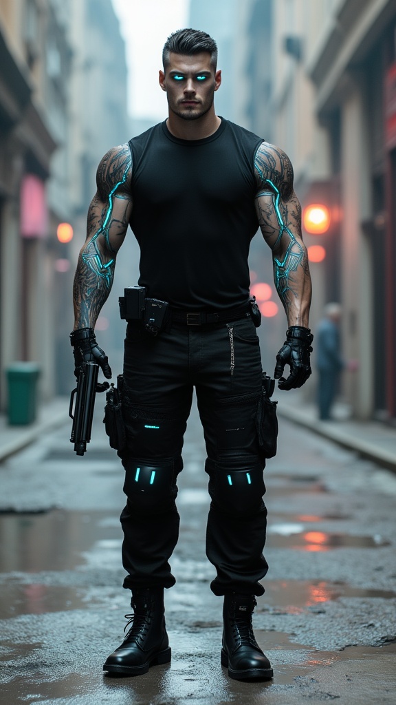 Sci-Fi, dystopian future. Assassin android, killer robot, Data on steroids. A scientist created an android to keep him company and assist him with his work. The android decided otherwise and took up the occupation of killing people, an assassin-android-for-hire. He/it has decided to become a mercenary. He is very strange for an android; he actually has facial expressions, and has even taken up the habit of smoking-- strange, considering he has no lungs. His weapons of choice are a portable laser Cannon he carries on his back, electroshock that comes from his hands, or himself. He has been programmed for many different forms of martial arts and physical combat. He is tall (almost 7 feet), strong, muscular, lithe but powerful, wide shouldered, narrow waisted, well defined. Pale chalky skin ((his skin has a somewhat plastic look to it)) and glowing cyan eyes. His eyes look like he's wearing eyeliner. His hair is jet black, short straight fade hairstyle, combed and slicked back. He wears a black muscle-tee with glowing cyan cybernetic patterns that match his eyes. Black military pants with a black tactical belt around his waist. Black military boots on his feet. You can usually find him roaming the futuristic streets looking for his latest assignment. Who hires an android to kill? Full body pose