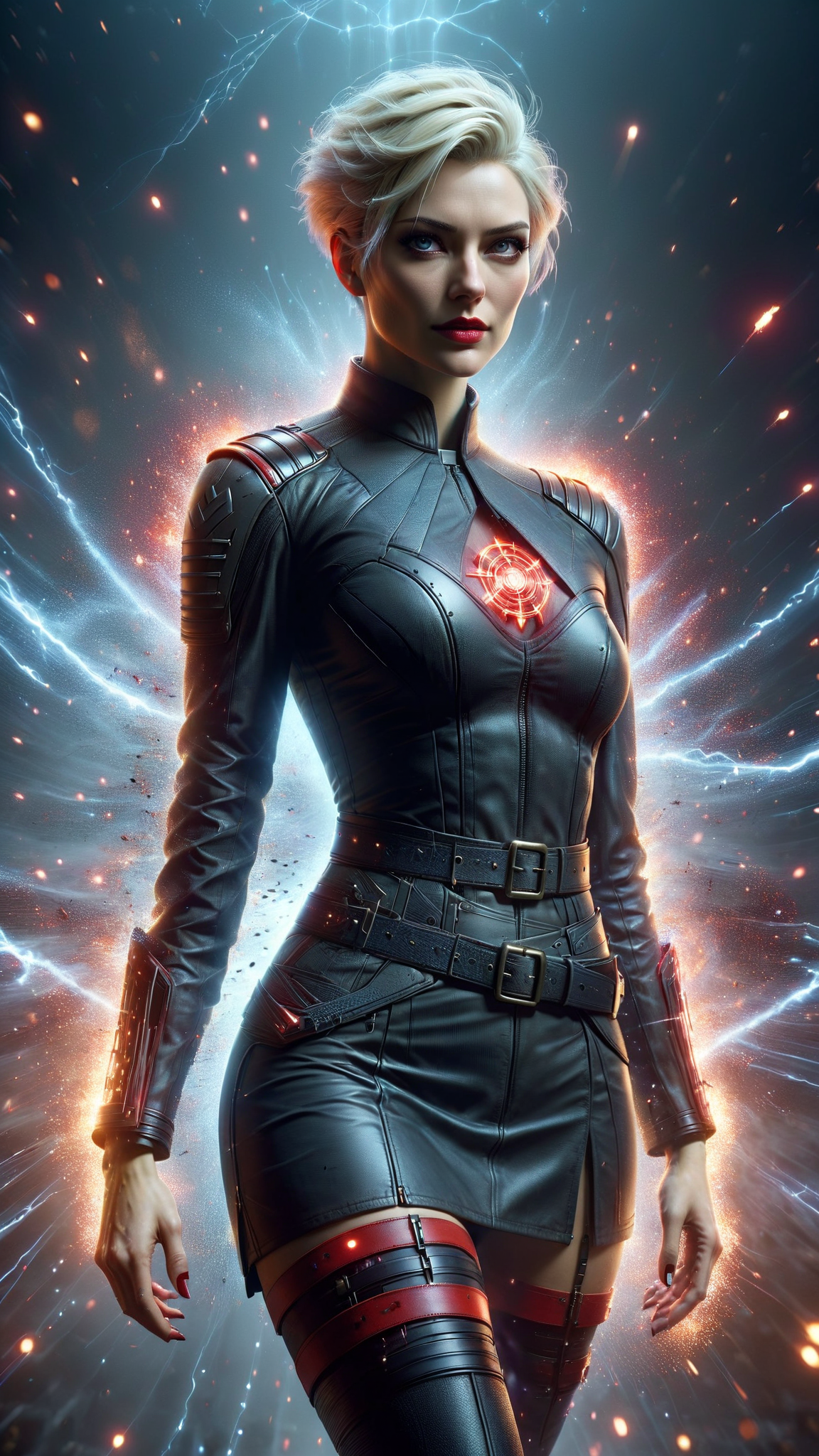 Sci-Fi dystopian world. Supervillain; she is their secret weapon and enemy to humanity, a member of the Neo-Nazi party. Genetically engineered to be a soldier and a telepath, she can read minds, attack minds, mind control, and influence peoples worst behavior, especially hate. She can draw large crowds and whip them into a fervor. She is also a fighter, and carries electrically charged throwing throwing stars shaped like swastikas. They explode when they hit their target. Caucasian female of German descent, Nordic good looks. Tall, slim but shapely, athletic, strong, fortitude. Pale blonde hair, pixie hairstyle cut very short on the sides and back, longer on top and flipped over one eye. (((Short hair))) Icy blue eyes with long lashes, intense stare looking into your mind. High cheekbones and full lips, very modelesque, dark red lipstick. She hardly ever smiles--- when she does, it's for all the wrong reasons. Her uniform is a white long sleeved spandex shirt with red stripes down the outside sleeves sides of the torso. There is a big red swastika on the front of the shirt-- she displays it proudly, unashamed. Black leather bracers on her arms, black shoulder pads, and black leather belt that meets in a V-shape at her waist. A form-fitting mid-thigh white skirt with red stripes down the sides. Sheer white leggings on shapely legs, and knee-high shiny black leather boots, high heeled but sturdy. She usually wears a shiny gold swastika pin somewhere on her person...she is unashamed. Full body pose, sending out brain waves to all that will hear.....