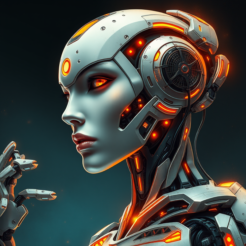 Sci-fi fantasy illustration of a stunningly beautiful robot, featuring hyper-detailed realism, blending dark white and vibrant orange hues; evokes classicist portraiture with a palette of dark gold and aquamarine. Incorporates hard-edge, realist detail, showcasing technological marvels, exuding an aura of elegance and mystery.