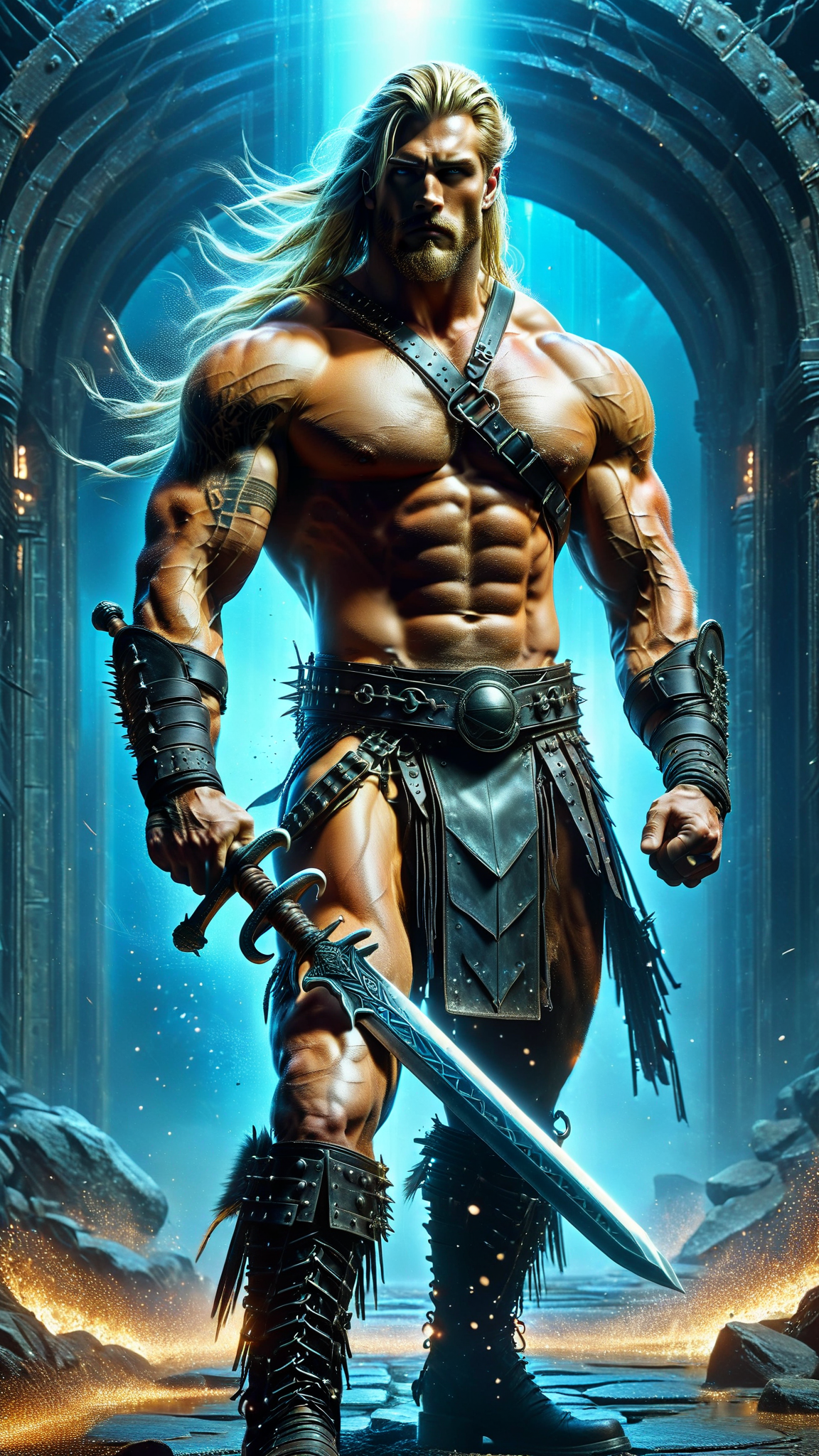 Sci-Fi, futuristic Barbarian on post- apocalyptic Earth. Male, manly, hypermasculine, tall, muscular, brute, sinewy, broad chested, bodybuilder, big muscles. Light-blue eyes, strong brow and squared chin. No facial hair A-side from a soul patch. Long, wild golden blonde shoulder length hair that falls over face. Black X pattern tattooed over eyes/face. Black leather harness and straps over bare chest. Silver chains wrapped around biceps, black leather bracers on arms. Chain metal kilt barely covering his strong, powerful legs. Knee- high black leather boots with many buckles. Full body pose. He carries a gigantic battle sword that he wields easily because of his Olympic body.