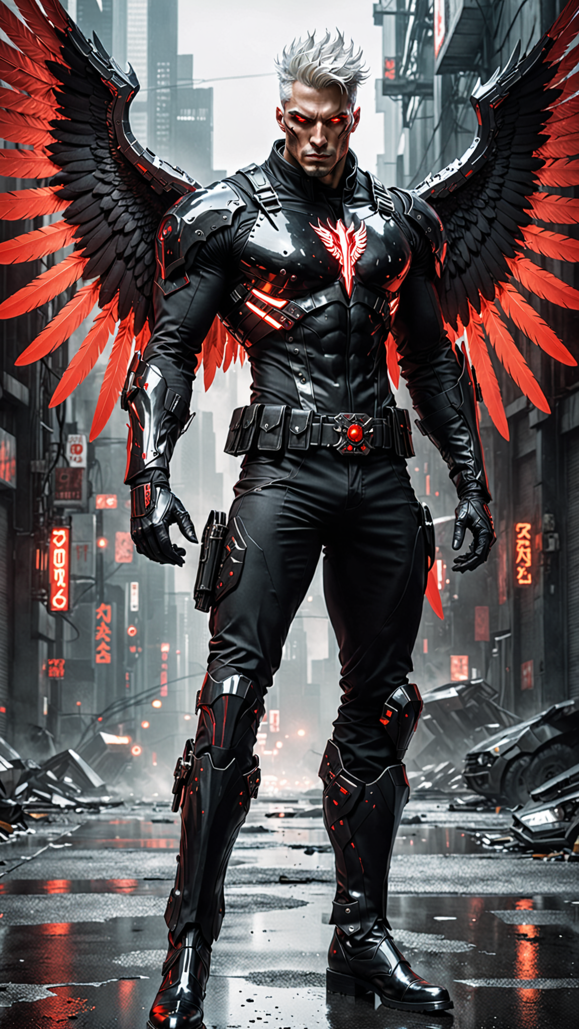 Sci-Fi, futuristic dysopia. Death Angel, futuristic assassin with futuristic tech. Hypermasculine male. Very tall (6 ft 8), muscular, strong, sinewy, Olympic build, weightlifter. Broad chest, narrow waist, strong powerful legs. Pale, chalk-white skin, no color. Short white hair in a spiky fade, hair on top stands up. Handsome but very pale. Strong brow and jaw, thick white eyebrows, glowing red eyes. Intense gaze, threatening. White soul patch on face. Form fitting full black uniform with crimson red patterns on the chest, arms and legs. Uniform is shiny black material, full body coverage. Belt is futuristic tech with glowing red light in the center/buckle. Black gloves, black knee-high boots with crimson red designs. Angel wings, predominantly black with dark red highlight feathers. Wings and feathers are metallic black and red. Full body pose, flying through lightning.
