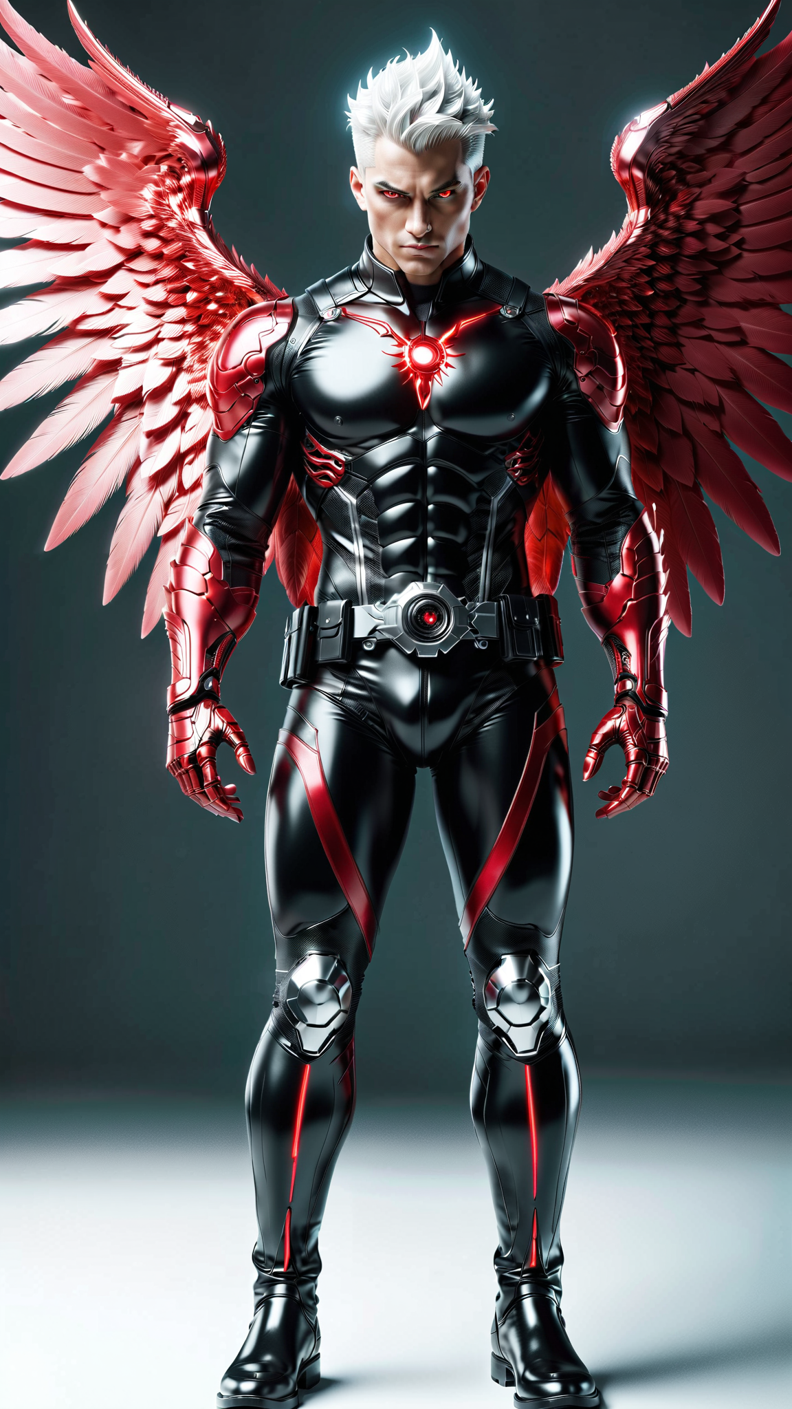 Sci-Fi, futuristic dysopia. Death Angel, futuristic assassin with futuristic tech. Hypermasculine male. Very tall (6 ft 8), muscular, strong, sinewy, Olympic build, weightlifter. Broad chest, narrow waist, strong powerful legs. Pale, chalk-white skin, no color. Short white hair in a spiky fade, hair on top stands up. Handsome but very pale. Strong brow and jaw, thick white eyebrows, glowing red eyes. Intense gaze, threatening. White soul patch on face. Form fitting full black uniform with crimson red patterns on the chest, arms and legs. Uniform is shiny black material, full body coverage. Belt is futuristic tech with glowing red light in the center/buckle. Black gloves, black knee-high boots with crimson red designs. Angel wings, predominantly black with dark red highlight feathers. Wings and feathers are metallic black and red. Full body pose, flying through lightning.