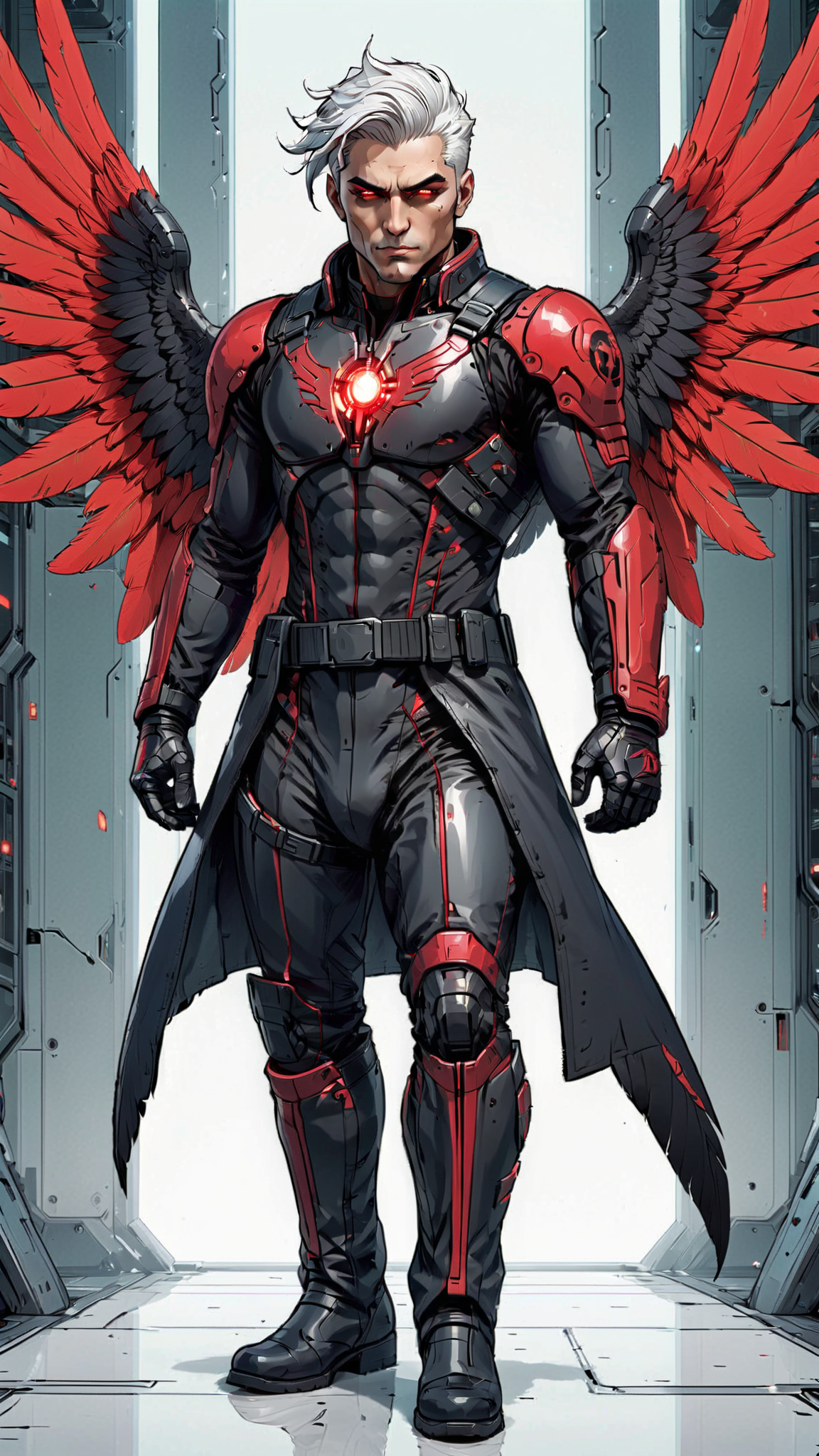 Sci-Fi, futuristic dysopia. Death Angel, futuristic assassin with futuristic tech. Hypermasculine male. Very tall (6 ft 8), muscular, strong, sinewy, Olympic build, weightlifter. Broad chest, narrow waist, strong powerful legs. Pale, chalk-white skin, no color. Short white hair in a spiky fade, hair on top stands up. Handsome but very pale. Strong brow and jaw, thick white eyebrows, glowing red eyes. Intense gaze, threatening. White soul patch on face. Form fitting full black uniform with crimson red patterns on the chest, arms and legs. Uniform is shiny black material, full body coverage. Belt is futuristic tech with glowing red light in the center/buckle. Black gloves, black knee-high boots with crimson red designs. Angel wings, predominantly black with dark red highlight feathers. Wings and feathers are metallic black and red. Full body pose, flying through lightning.