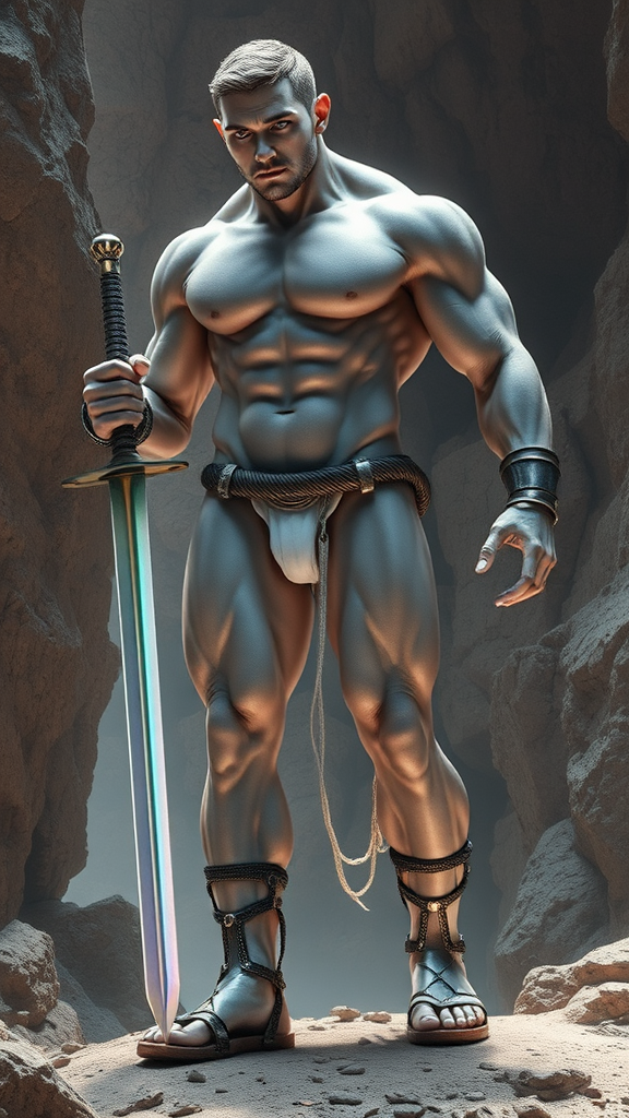 Sci-Fi futuristic fantasy, legend, homo-erotica. On an Alien world, handsome giants known as Brutons emerged from the rock formations. They look like living statues with their marble-like skin and gemstone colored eyes. Ruggedly handsome, masculine, beautiful men. They stand at 7feet tall or taller, and their bodies are physical perfection with broad chests and backs, narrow waists, muscular sinewy bodies, strong massive arms, powerful legs. Their bodies are sculpted to perfection by nature, and they wear very little clothing other than iridescent diaphanous white thongs on their girthy genitals and metallic sandals with straps up to the calves. There may be metallic bands around the tops of their biceps, and metallic bracers on their arms. They all wear metallic circlets around their foreheads, their hair is short and sculpted, usually a wavy fade hairstyle of any color. They help build the futuristic city as well as guard it, carrying huge shining swords or fighting with their own massive muscles. When they are not standing at attention, they keep company with each other, laying together and absorbing sunlight. They do not sweat, but their bodies glisten and sparkle from the microcrystals inside their bodies. They do not speak, but share a telepathic bond with one another. They are an all-male race, looking only to each other for pleasure when not building or gaurding. The other aliens on their planet appreciate and love them very much for all they do. {{{MASTERPIECE}}}