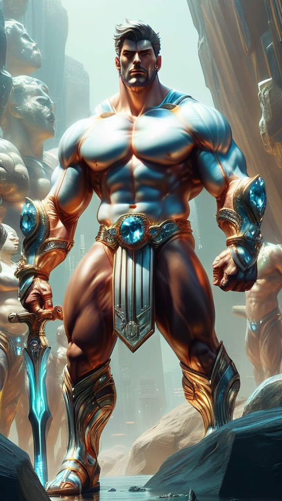 Sci-Fi futuristic fantasy, legend, homo-erotica. On another world, handsome giants known as Brutons emerged from the rock formations. They look like living statues, resembling bodybuilders or Greek wrestlers with their marble-like skin and gemstone colored eyes that shine. They all wear short wavy fade hairstyles of any color. Metallic circlet headbands around their foreheads. Ruggedly handsome, masculine, beautiful men with strong brows and sculpted jaws. Their faces are serene and peaceful. They stand at 7feet tall or taller, and their bodies are physical perfection with broad chests and backs, narrow waists, muscular sinewy bodies, strong massive arms, powerful legs. Their bodies are sculpted to perfection by nature, and they wear very little clothing; iridescent diaphanous white thongs on their girthy loins and metallic sandals with straps up to the calves. Metallic bands around the tops of their biceps, and metallic bracers on their arms. They help build the futuristic city as well as guard it, carrying huge shining swords or fighting with their own massive muscles. When they are not standing at attention, they keep company with each other, laying together and absorbing sunlight. They do not sweat, but their bodies glisten and sparkle from the microcrystals inside their bodies. They do not speak, but share a telepathic bond with one another. They are an all-male race, looking only to each other for pleasure when not building or gaurding. The other beings on their planet appreciate and love them very much for all they do. They stand guard in front of shining, glittering futuristic cities, the lights reflecting off of their beautiful bodies. {{{MASTERPIECE}}}