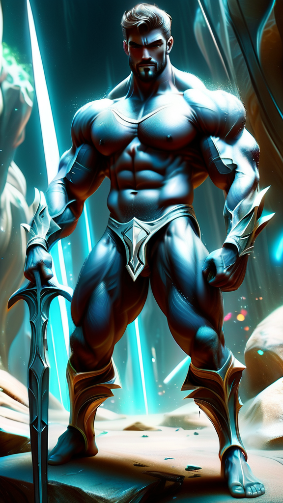 Sci-Fi futuristic fantasy, legend, homo-erotica. On another world, handsome giants known as Brutons emerged from the rock formations. They look like living statues, resembling bodybuilders or Greek wrestlers with their marble-like skin and gemstone colored eyes that shine. They all wear short wavy fade hairstyles of any color. Metallic circlet headbands around their foreheads. Ruggedly handsome, masculine, beautiful men with strong brows and sculpted jaws. Their faces are serene and peaceful. They stand at 7feet tall or taller, and their bodies are physical perfection with broad chests and backs, narrow waists, muscular sinewy bodies, strong massive arms, powerful legs. Their bodies are sculpted to perfection by nature, and they wear very little clothing; iridescent diaphanous white thongs on their girthy loins and metallic sandals with straps up to the calves. Metallic bands around the tops of their biceps, and metallic bracers on their arms. They help build the futuristic city as well as guard it, carrying huge shining swords or fighting with their own massive muscles. When they are not standing at attention, they keep company with each other, laying together and absorbing sunlight. They do not sweat, but their bodies glisten and sparkle from the microcrystals inside their bodies. They do not speak, but share a telepathic bond with one another. They are an all-male race, looking only to each other for pleasure when not building or gaurding. The other beings on their planet appreciate and love them very much for all they do. They stand guard in front of shining, glittering futuristic cities, the lights reflecting off of their beautiful bodies. {{{MASTERPIECE}}}