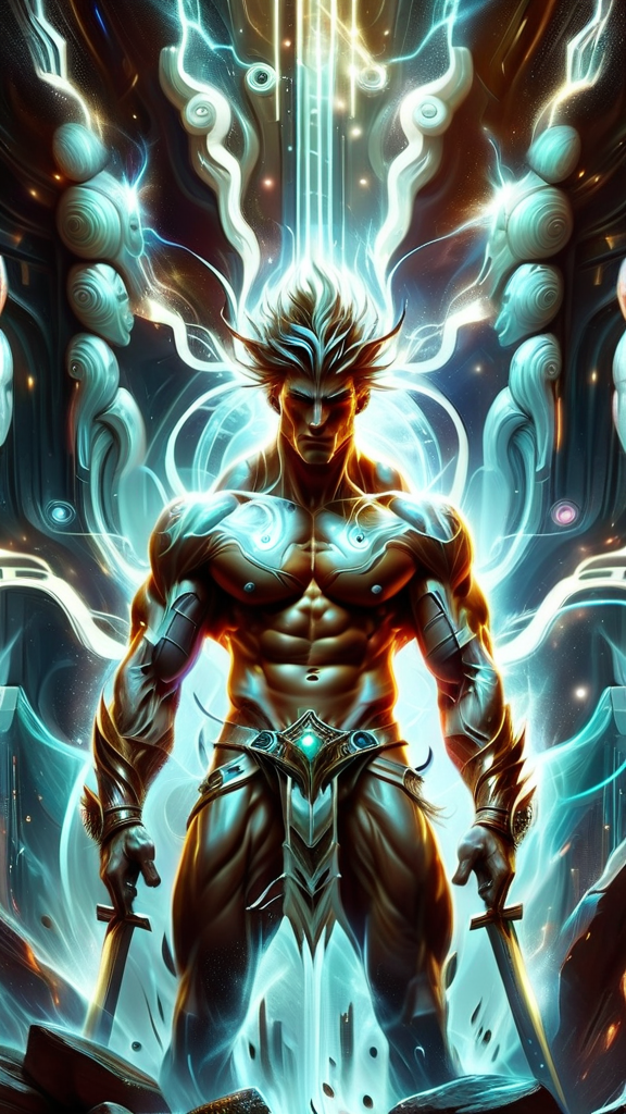 Sci-Fi futuristic fantasy, legend, homo-erotica. On another world, handsome giants known as Brutons emerged from the rock formations. They look like living statues, resembling bodybuilders or Greek wrestlers with their marble-like skin and gemstone colored eyes that shine. They all wear short wavy fade hairstyles of any color. Metallic circlet headbands around their foreheads. Ruggedly handsome, masculine, beautiful men with strong brows and sculpted jaws. Their faces are serene and peaceful. They stand at 7feet tall or taller, and their bodies are physical perfection with broad chests and backs, narrow waists, muscular sinewy bodies, strong massive arms, powerful legs. Their bodies are sculpted to perfection by nature, and they wear very little clothing; iridescent diaphanous white thongs on their girthy loins and metallic sandals with straps up to the calves. Metallic bands around the tops of their biceps, and metallic bracers on their arms. They help build the futuristic city as well as guard it, carrying huge shining swords or fighting with their own massive muscles. When they are not standing at attention, they keep company with each other, laying together and absorbing sunlight. They do not sweat, but their bodies glisten and sparkle from the microcrystals inside their bodies. They do not speak, but share a telepathic bond with one another. They are an all-male race, looking only to each other for pleasure when not building or gaurding. The other beings on their planet appreciate and love them very much for all they do. They stand guard in front of shining, glittering futuristic cities, the lights reflecting off of their beautiful bodies. {{{MASTERPIECE}}}