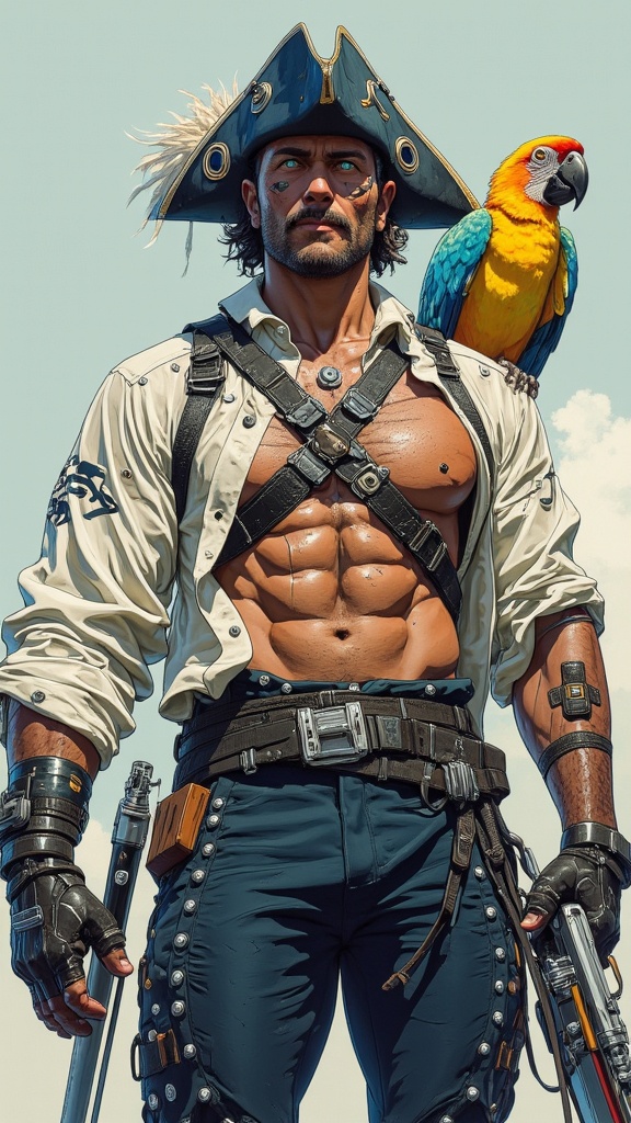 Sci-Fi, futuristic hero. Swashbuckler, space pirate, handsome intergalactic buccaneer. Tall, muscular, sinewy, big muscled, perfect physique. Broad chest, wide shoulders and back, narrow waist, muscular thighs and legs. Hirsute hairy chest, arms and legs. Handsome masuline rugged face with lapis-blue eyes, strong brow, squared jaw. Narrow mustache with soulpatch on face. He has a warm, sexy smile. Short dark brown curly fade with close cut on sides and back, longer curls on top. Dark blue tricorn pirate hat with silver grommets,and a white feather plume on the side. Black leather harness with silver buckle strapped across his chest. A loose-fitting sheer silky white long sleeved shirt with sliver threads, open to reveal his hairy chest. A wide black leather belt with silver studs around his waist. Tight dark blue pants with silver grommets down the sides tucked into knee-high black leather bucket boots. An alien parrot with multi-colored glowing neon feathers sits on his shoulder while his spaceship fires up for his next adventure. Full body pose, lookingbdashing and handsome. {{{MASTERPIECE}}}