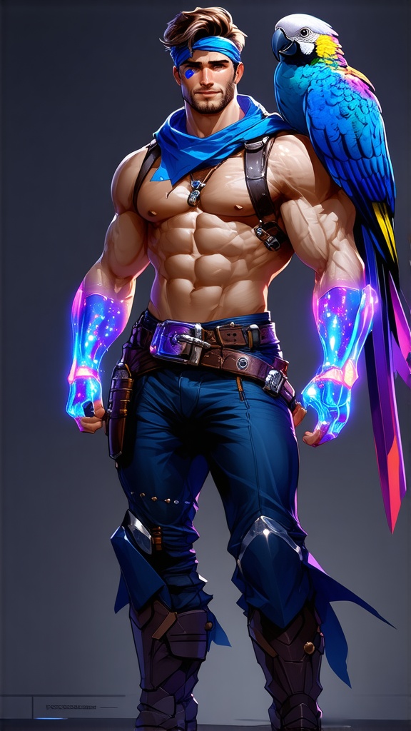 Sci-Fi, futuristic hero. Swashbuckler, space pirate, handsome intergalactic buccaneer. Masculine Caucasian male. Tall, muscular, sinewy, big muscled, perfect physique. Broad chest, wide shoulders and back, narrow waist, muscular thighs and legs. Hirsute hairy chest, arms and legs. Handsome masuline rugged face with lapis-blue eyes, strong brow, squared jaw. Soulpatch on otherwise hairless face. He has a warm, sexy smile. Short dark brown wavy fade hairstyle, close cut on sides and back, longer on top. Sapphire blue bandana with long ends tied around forehead. Black leather harness with silver buckle strapped across his shirtless hairy chest. Black leather bracers with silver grommets on his muscular arms. A wide black leather belt with silver studs around his waist. Tight sapphire blue pants with silver grommets down the sides tucked into knee-high black leather bucket boots. An alien parrot with multi-colored glowing neon feathers sits on his shoulder. He weilds a brightly glowing violet-blue lightsaber while his spaceship fires up for his next adventure. Full body pose, looking dashing and handsome, a galaxy swirling in the background. {{{MASTERPIECE}}}