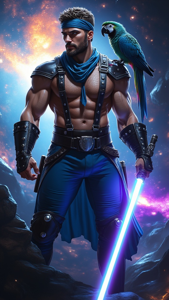 Sci-Fi, futuristic hero. Swashbuckler, space pirate, handsome intergalactic buccaneer. Masculine Caucasian male. Tall, muscular, sinewy, big muscled, perfect physique. Broad chest, wide shoulders and back, narrow waist, muscular thighs and legs. Hirsute hairy chest, arms and legs. Handsome masuline rugged face with lapis-blue eyes, strong brow, squared jaw. Soulpatch on otherwise hairless face. He has a warm, sexy smile. Short dark brown wavy fade hairstyle, close cut on sides and back, longer on top. Sapphire blue bandana with long ends tied around forehead. Black leather harness with silver buckle strapped across his shirtless hairy chest. Black leather bracers with silver grommets on his muscular arms. A wide black leather belt with silver studs around his waist. Tight sapphire blue pants with silver grommets down the sides tucked into knee-high black leather bucket boots. An alien parrot with multi-colored glowing neon feathers sits on his shoulder. He weilds a brightly glowing violet-blue lightsaber while his spaceship fires up for his next adventure. Full body pose, looking dashing and handsome, a galaxy swirling in the background. {{{MASTERPIECE}}}