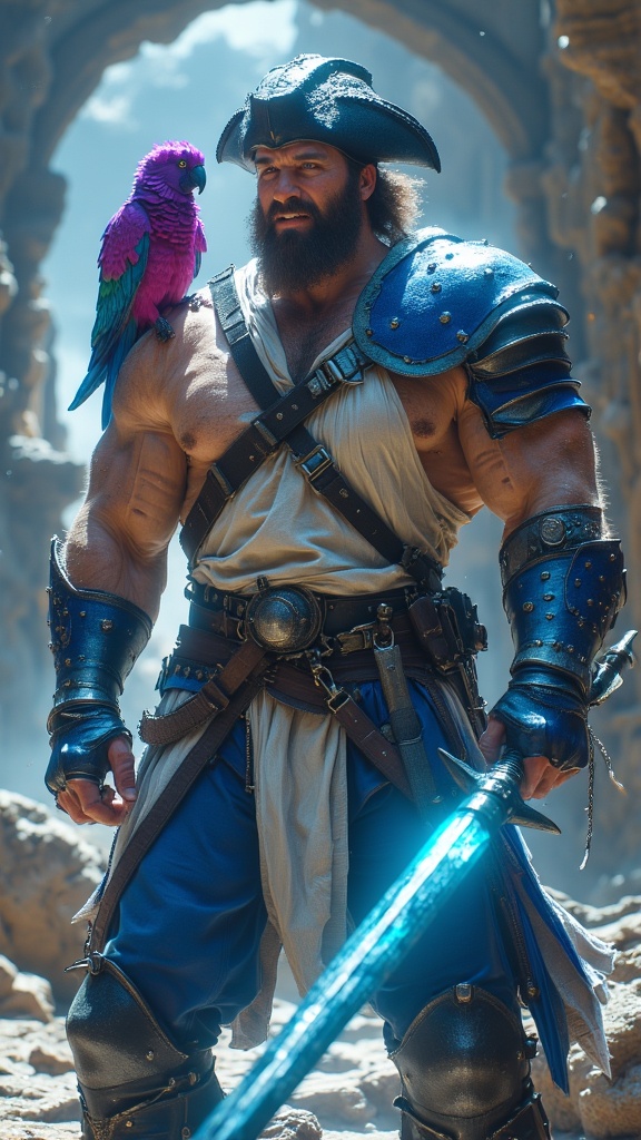 Sci-Fi, futuristic hero. Swashbuckler, space pirate, handsome intergalactic buccaneer. Tall, muscular, sinewy, big muscled, perfect physique. Broad chest, wide shoulders and back, narrow waist, muscular thighs and legs. Hirsute hairy chest, arms and legs. Handsome masuline rugged face with lapis-blue eyes, strong brow, squared jaw. Narrow mustache and soulpatch on face. He has a warm, sexy smile. Sapphire blue tricorn pirate hat with silver grommets,and a white feather plume on the side. Short dark brown hair under hat, cut close on sides and back. Black leather harness with silver buckle strapped across his chest. A loose-fitting sheer silky white sleeveless shirt, open to reveal his hairy chest. A wide black leather belt with silver studs around his waist. Tight form-fitting sapphire blue pants with silver grommets down the sides tucked into knee-high black leather bucket boots. He weilds a blue-violet lightsaber in his fist. An alien parrot with multi-colored glowing neon feathers sits on his shoulder while his spaceship fires up for his next adventure. Full body pose, lookingbdashing and handsome. {{{MASTERPIECE}}}