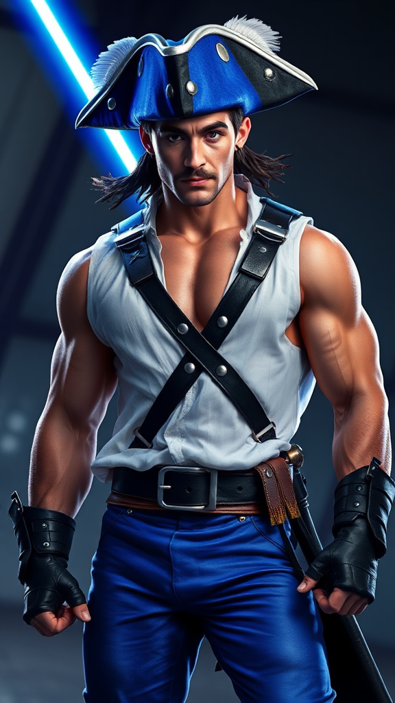 Sci-Fi, futuristic hero. Swashbuckler, space pirate, handsome intergalactic buccaneer. Tall, muscular, sinewy, big muscled, perfect physique. Broad chest, wide shoulders and back, narrow waist, muscular thighs and legs. Hirsute hairy chest, arms and legs. Handsome masuline rugged face with lapis-blue eyes, strong brow, squared jaw. Narrow mustache and soulpatch on face. He has a warm, sexy smile. Sapphire blue tricorn pirate hat with silver grommets,and a white feather plume on the side. Short dark brown hair under hat, cut close on sides and back. Black leather harness with silver buckle strapped across his chest. A loose-fitting sheer silky white sleeveless shirt, open to reveal his hairy chest. A wide black leather belt with silver studs around his waist. Tight form-fitting sapphire blue pants with silver grommets down the sides tucked into knee-high black leather bucket boots. He weilds a blue-violet lightsaber in his fist. An alien parrot with multi-colored glowing neon feathers sits on his shoulder while his spaceship fires up for his next adventure. Full body pose, lookingbdashing and handsome. {{{MASTERPIECE}}}