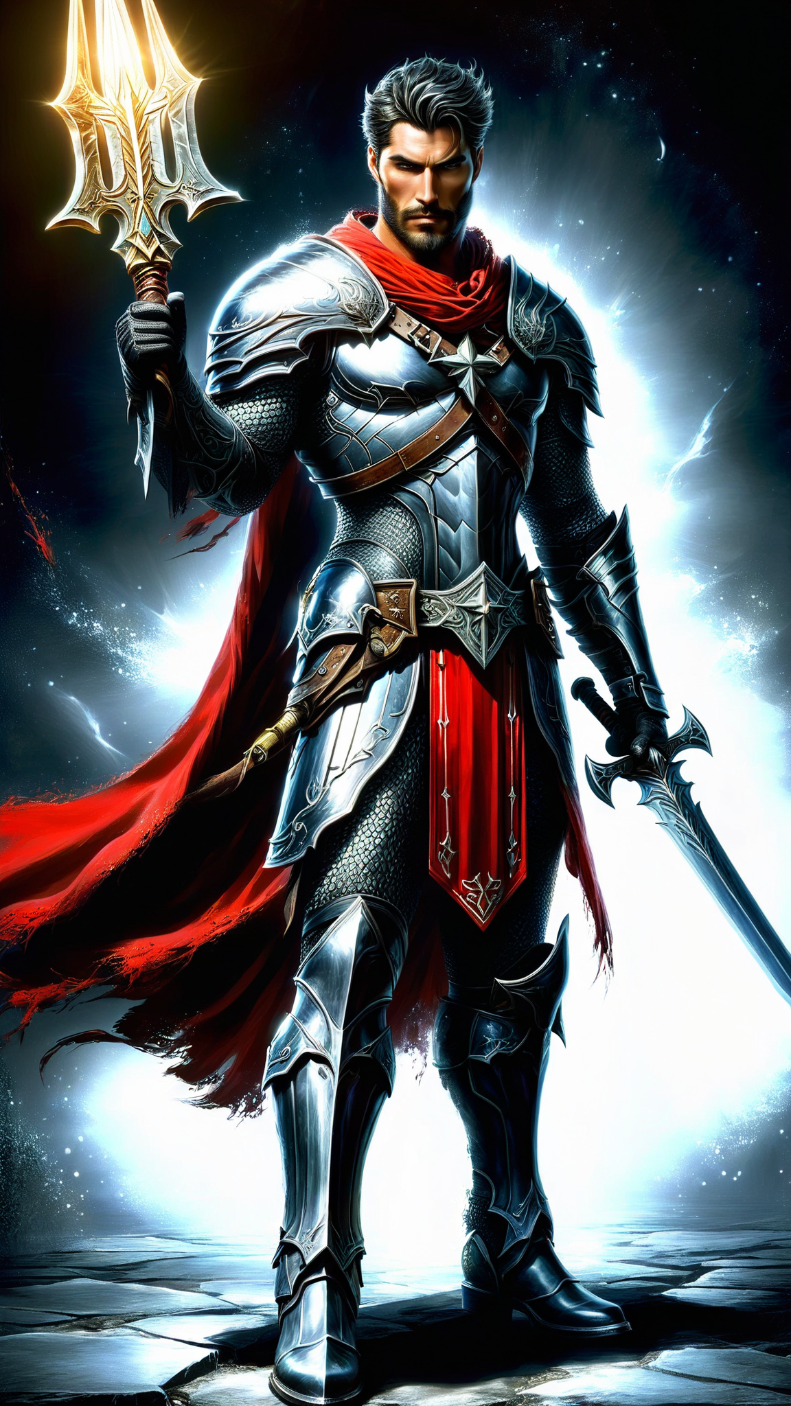 Sci-Fi, Futuristic Super-hero , Christian mystic, modern-day Knight/warrior. He lives in an ultra-futuristic society, but he can see dark forces that most people don't, and he has the power and might to fight against them! He can do everything a wizard does, but it's his faith in God that empowers him. He is invulnerable to most harm, and he carries a long golden glaive with a huge shining white gem. This gem shines with holy light and drives away shadows and demons, or destroy them if needed. It also has a sharp tip that he can use as a weapon like a spear. Tall, strong, muscular, wide shouldered, broad backed, narrow waist, sinewy, hairy chest and legs. Caucasian male of Mediterranean descent, short curly black hair cut extremely short on the sides and back. He wears a thick silver circlet around his head. Strong brow and jaw, intense Hazel eyes. Full well-trimmed beard and mustache. Shiny silver pauldrons on shoulders, shiny silver armor- chestplate and abs, a white diamond Cross on the chestplate, a Star-of-Bethlahem in white crystal embedded within the Cross. He has glowing red glyphs on his armor. He is shirtless under his armor. Scarlet red pants with shiny silver thigh and shin guards on the legs, metallic silver boots to complete the armor. There are red glyphs on the boots. Long Scarlet wizard's cape with thick silver trim around the edges, Christian symbols of protection embedded within the silver trim. His arms are bare, but he does wear silver gloves with shiny red bracers on his arms. Full body pose, arm with glaive raised in defiance, hair under his arm visible and thick.
