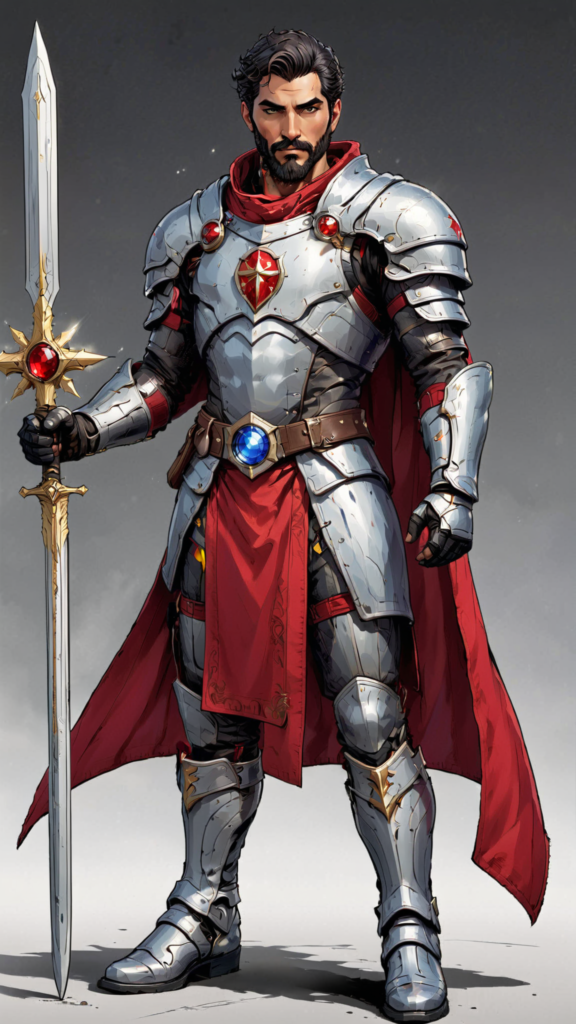 Sci-Fi, Futuristic Super-hero , Christian mystic, modern-day Knight/warrior. He lives in an ultra-futuristic society, but he can see dark forces that most people don't, and he has the power and might to fight against them! He can do everything a wizard does, but it's his faith in God that empowers him. He is invulnerable to most harm, and he carries a long golden glaive with a huge shining white gem. This gem shines with holy light and drives away shadows and demons, or destroy them if needed. It also has a sharp tip that he can use as a weapon like a spear. Tall, strong, muscular, wide shouldered, broad backed, narrow waist, sinewy, hairy chest and legs. Caucasian male of Mediterranean descent, short curly black hair cut extremely short on the sides and back. He wears a thick silver circlet around his head. Strong brow and jaw, intense Hazel eyes. Full well-trimmed beard and mustache. Shiny silver pauldrons on shoulders, shiny silver armor- chestplate and abs, a white diamond Cross on the chestplate, a Star-of-Bethlahem in white crystal embedded within the Cross. He has glowing red glyphs on his armor. He is shirtless under his armor. Scarlet red pants with shiny silver thigh and shin guards on the legs, metallic silver boots to complete the armor. There are red glyphs on the boots. Long Scarlet wizard's cape with thick silver trim around the edges, Christian symbols of protection embedded within the silver trim. His arms are bare, but he does wear silver gloves with shiny red bracers on his arms. Full body pose, arm with glaive raised in defiance, hair under his arm visible and thick.