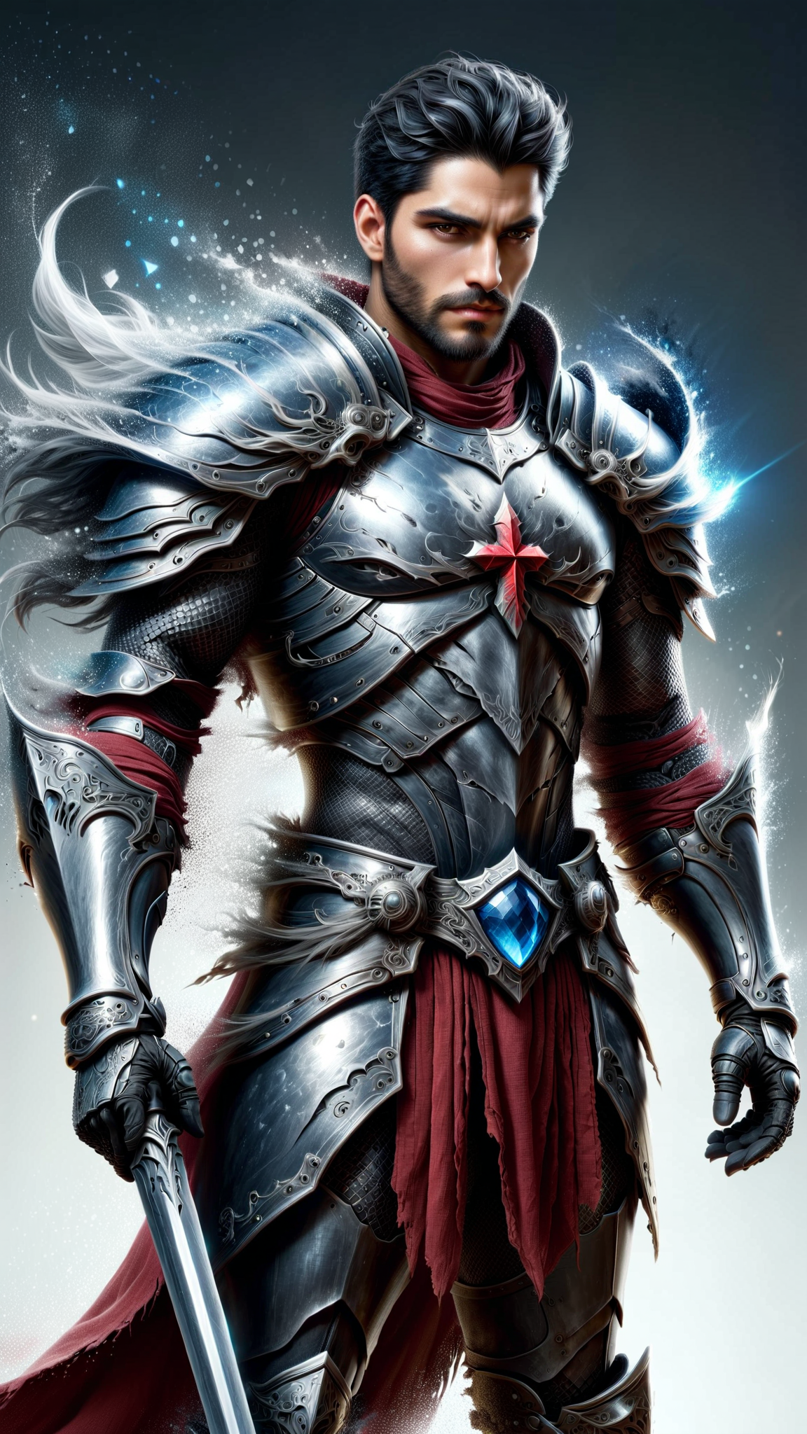 Sci-Fi, Futuristic Super-hero , Christian mystic, modern-day Knight/warrior. He lives in an ultra-futuristic society, but he can see dark forces that most people don't, and he has the power and might to fight against them! He can do everything a wizard does, but it's his faith in God that empowers him. He is invulnerable to most harm, and he carries a long golden glaive with a huge shining white gem. This gem shines with holy light and drives away shadows and demons, or destroy them if needed. It also has a sharp tip that he can use as a weapon like a spear. Tall, strong, muscular, wide shouldered, broad backed, narrow waist, sinewy, hairy chest and legs. Caucasian male of Mediterranean descent, short curly black hair cut extremely short on the sides and back. He wears a thick silver circlet around his head. Strong brow and jaw, intense Hazel eyes. Full well-trimmed beard and mustache. Shiny silver pauldrons on shoulders, shiny silver armor- chestplate and abs, a white diamond Cross on the chestplate, a Star-of-Bethlahem in white crystal embedded within the Cross. He has glowing red glyphs on his armor. He is shirtless under his armor. Scarlet red pants with shiny silver thigh and shin guards on the legs, metallic silver boots to complete the armor. There are red glyphs on the boots. Long Scarlet wizard's cape with thick silver trim around the edges, Christian symbols of protection embedded within the silver trim. His arms are bare, but he does wear silver gloves with shiny red bracers on his arms. Full body pose, arm with glaive raised in defiance, hair under his arm visible and thick.