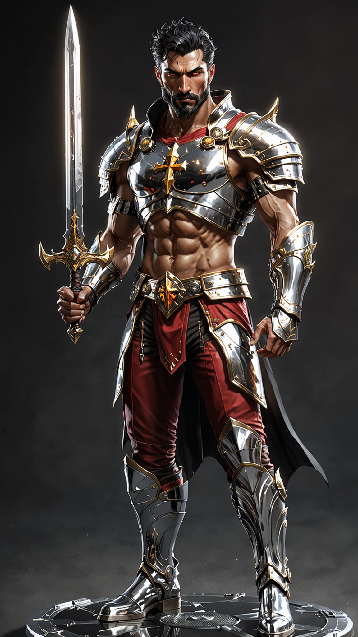 Sci-Fi, Futuristic Super-hero , Christian mystic, modern-day warrior. He lives in an ultra-futuristic society, but he can see dark forces that most people don't. He is invulnerable to most harm, and he carries a long golden glaive with a huge shining white gem. This gem shines with holy light and drives away shadows and demons, or destroy them if needed. It also has a sharp tip that he can use as a weapon like a spear. The arm holding the glaive is raised in defiance, the hair in his armpit is visible and thick. Tall, strong, muscular, wide shouldered, broad backed, narrow waist, sinewy, hairy chest and legs. Caucasian male of Mediterranean descent, short curly black hair cut extremely short on the sides and back. He wears a thick chrome circlet around his head. Strong brow and jaw, intense Hazel eyes. Full well-trimmed beard and mustache. Shiny chrome pauldrons on shoulders, transparent glass armor- chestplate and abs, a white diamond Cross on the chestplate. He has glowing gold glyphs on his armor. He is shirtless under his armor, so you can see his hairy chest. Scarlet red pants with shiny glass thigh and shin guards on the legs, metallic silver boots to complete the armor. A chrome tech belt with shiny gold glyphs. There are gold glyphs on the boots. Long Scarlet cape with thick silver trim around the edges. His arms are bare, but he does wear clear chrome bracers on his arms. Full body pose, arm with glaive raised in defiance, hair under his arm visible and thick.