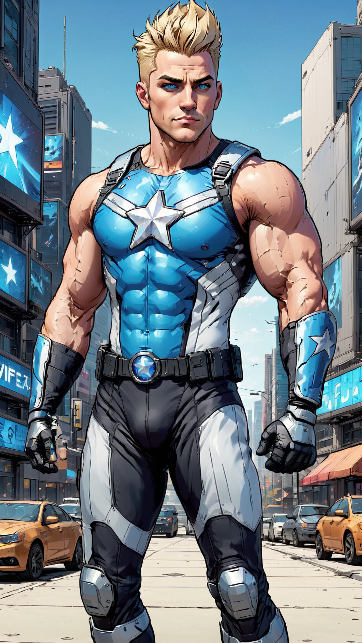 Sci-Fi futuristic tech meets the American soldier. Hypermasculine Caucasian male, tall, strong, muscular, sinewy, broad chest and back, narrow waist, big arms and powerful legs. Bodybuilder. Sandy-blonde hair, faux-hawk close on the sides and spiky on top. Strong brow and jaw, handsome face, blue-grey eyes usually covered by sapphire blue solar shields/goggles. Blonde chevron mustache on his face. Air Force blue spandex outfit; long sleeved mesh shirt with white cut-out star on the chest. Silver shield-shaped shoulder pads with black trim on shoulders, metallic power/energy gloves with the same style. Spandex pants stretched over muscular legs and a bulging groin, white stripes and stars down the sides of his thighs. Metallic black knee-high boots with same white stripes and stars across the tops. He carries a round holographic energy shield that can expand to protect him and others. A futuristic jetpack in blue, silver and black strapped across his back to help him fly. Full body pose, him flying through the skies.