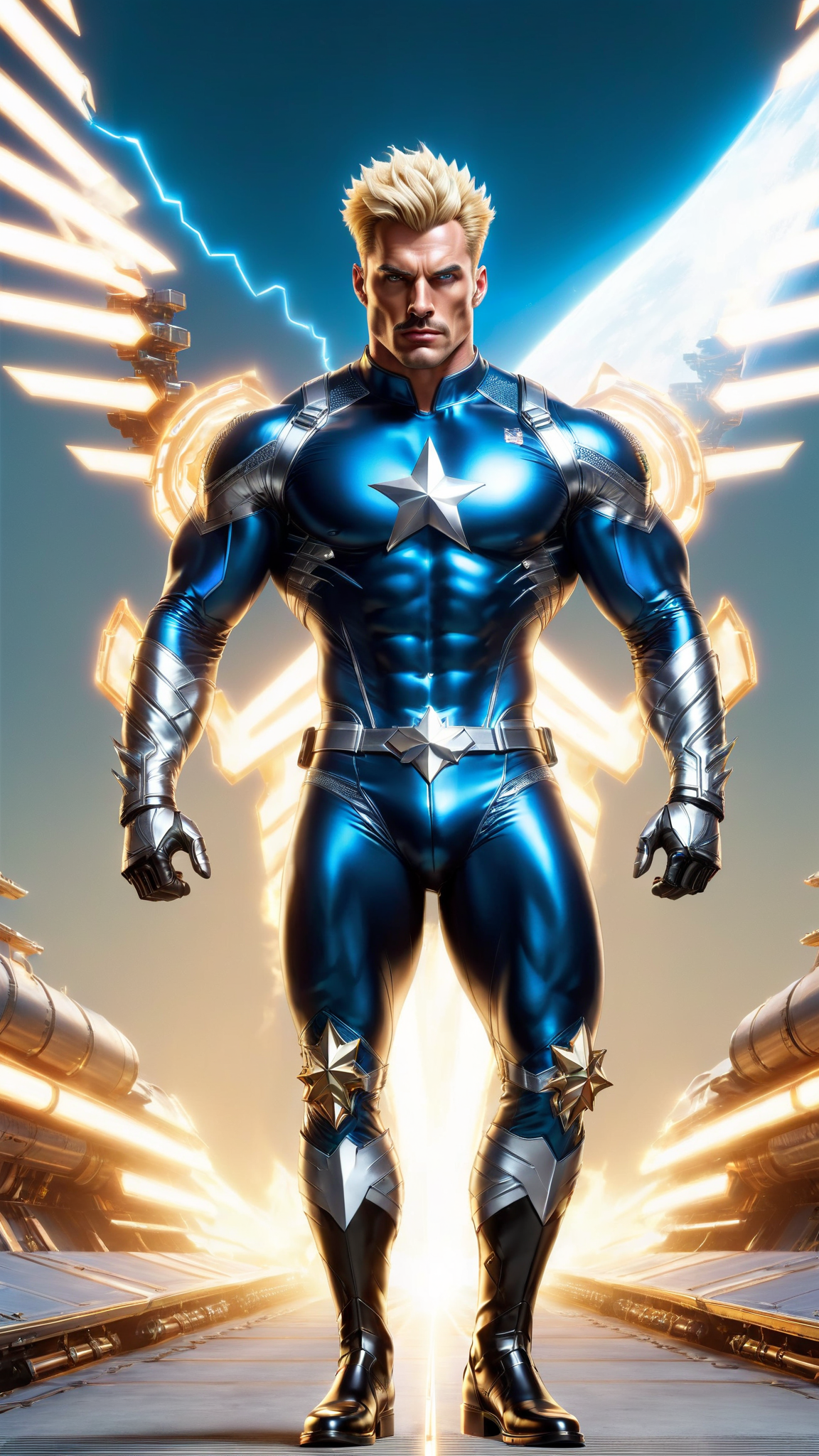 Sci-Fi futuristic tech meets the American soldier. Hypermasculine Caucasian male, tall, strong, muscular, sinewy, broad chest and back, narrow waist, big arms and powerful legs. Bodybuilder. Sandy-blonde hair, faux-hawk close on the sides and spiky on top. Strong brow and jaw, handsome face, blue-grey eyes usually covered by sapphire blue solar shields/goggles. Blonde chevron mustache on his face. Air Force blue spandex outfit; long sleeved mesh shirt with white cut-out star on the chest. Silver shield-shaped shoulder pads with black trim on shoulders, metallic power/energy gloves with the same style. Spandex pants stretched over muscular legs and a bulging groin, white stripes and stars down the sides of his thighs. Metallic black knee-high boots with same white stripes and stars across the tops. He carries a round holographic energy shield that can expand to protect him and others. A futuristic jetpack in blue, silver and black strapped across his back to help him fly. Full body pose, him flying through the skies.